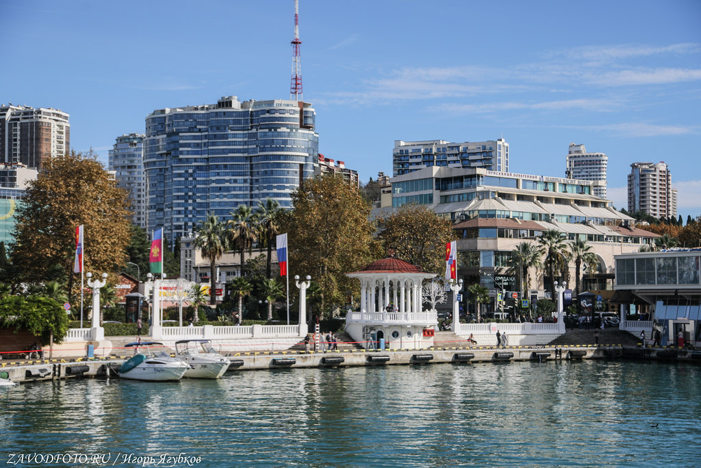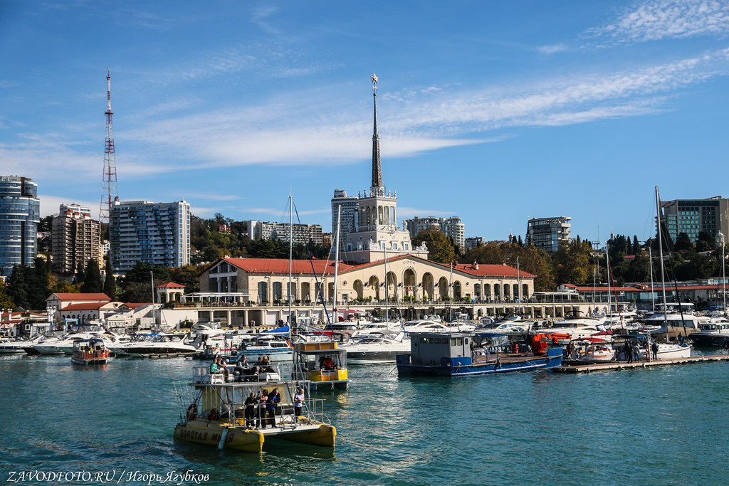В советское время Сочи были южными морскими воротами России. Почётный статус требовал соответствующего оформления, и в 1955 году сочинскую набережную украсил Морской вокзал. Архитектурный шедевр в неоклассическом стиле построен по проекту архитекторов, классиков сталинского ампира К. Алабяна и Л. Карлика. Монументальное здание с 3-ярусной башней и узнаваемым шпилем украшают скульптуры. На первом ярусе четыре женские фигуры символизируют времена года, статуи мужчин на втором - стороны света. Завершают композицию 12 дельфинов третьего яруса.