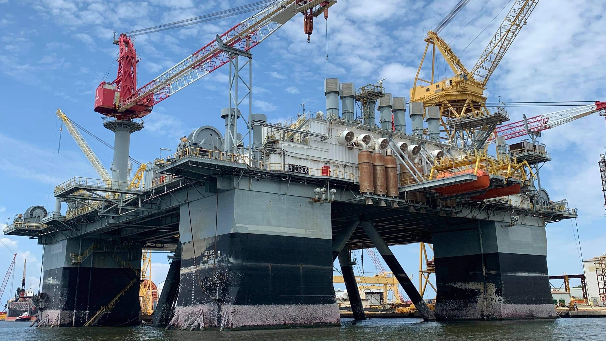 Глубоководная погружная буровая установка Ensco 8500 и один из вариантов морской стартовой платформы Деймос для системы Super Heavy – Starship. Первый пуск запланирован на 2022 г. Фото: Vivek Prakash, Kendall Dirks