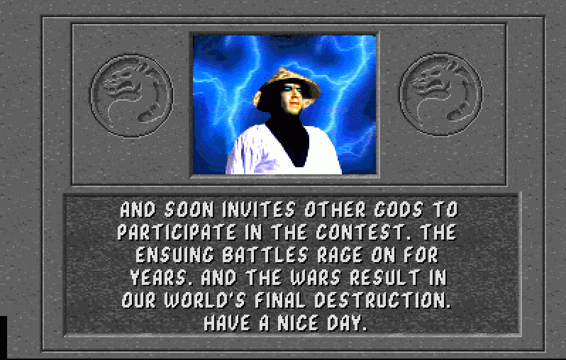 Победа Райдэна не станет для него неожиданностью. Он никогда не был высокого мнения о волшебстве Шан Цзуна и силе Горо. Тем более, не воспринимал всерьёз других участников турнира. Состязания со смертными ему быстро наскучат, и он пригласит других богов принять участие в турнире. В результате их битвы будут длиться годами, и это обернётся полным уничтожением нашего мира. Но какое богам до этого дело?