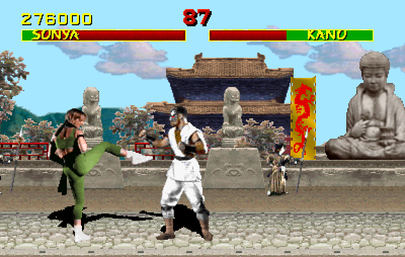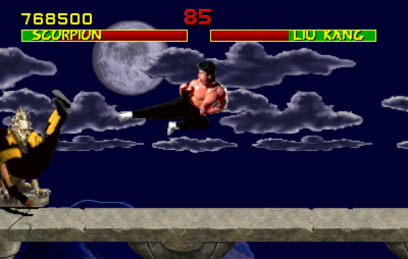 Прообраз Лю Кана - Брюс Ли. На скриншоте выше Лю Кан исполняет его коронный удар ногой в прыжке, и одет как герой Брюса Ли в фильмах "Кулак ярости" и "Выход дракона". Кстати, последний фильм послужил основой как для биографии Лю Кана, так и сюжета игры в целом.