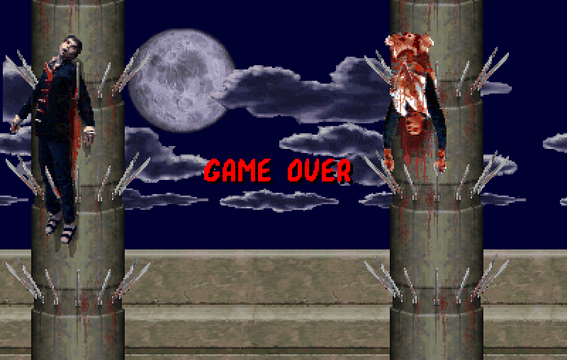 Обычно в случае проигрыша игрок видит надпись "game over" на фоне логова Горо, но также есть и другая, очень редкая заставка "game over", которая появляется примерно 1 раз из 30-ти. На экране появляется каменный мостик над Ямой, затем камера опускается вниз до самого дна.