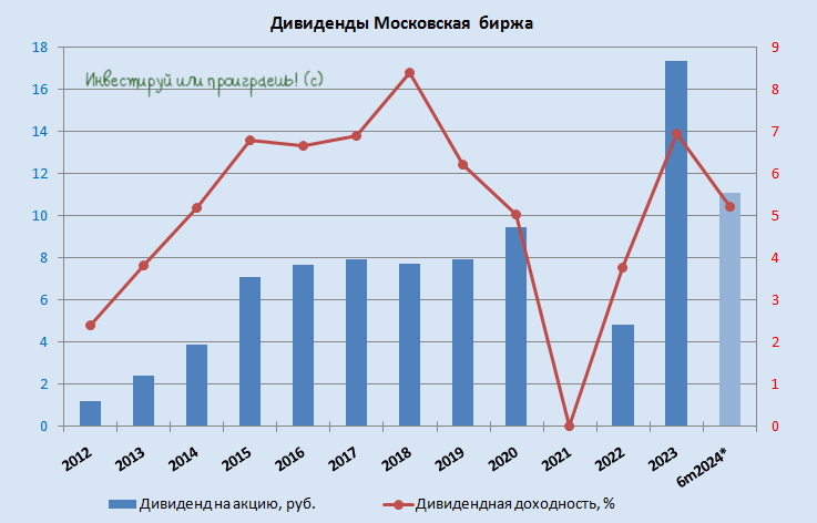 💼 По обновлённому уставу Мосбиржа направляет на дивиденды не менее 50% от чистой прибыли по МСФО. При этом по результатам прошлого года коэффициент выплат достиг 65%, и если рассчитывать на сохранение подобного показателя, то вклад первого полугодия составляет 11,09 руб. на акцию, что по текущим котировкам сулит полугодовую ДД=5,1%.