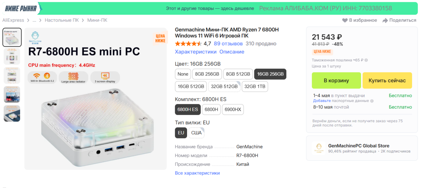 В рамках акции "Ниже Рынка" на Aliexpress в настоящий момент можно купить мощный мини-пк (Genmachine Мини-ПК AMD Ryzen 7 6800H, 16 ram, 256 ssd) всего за 21543 рубля.