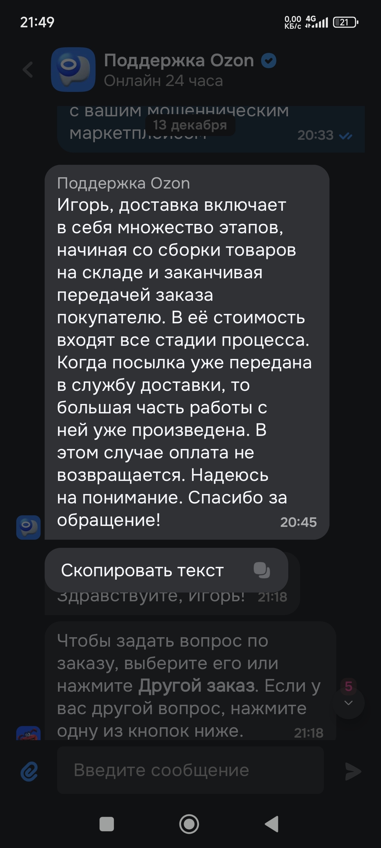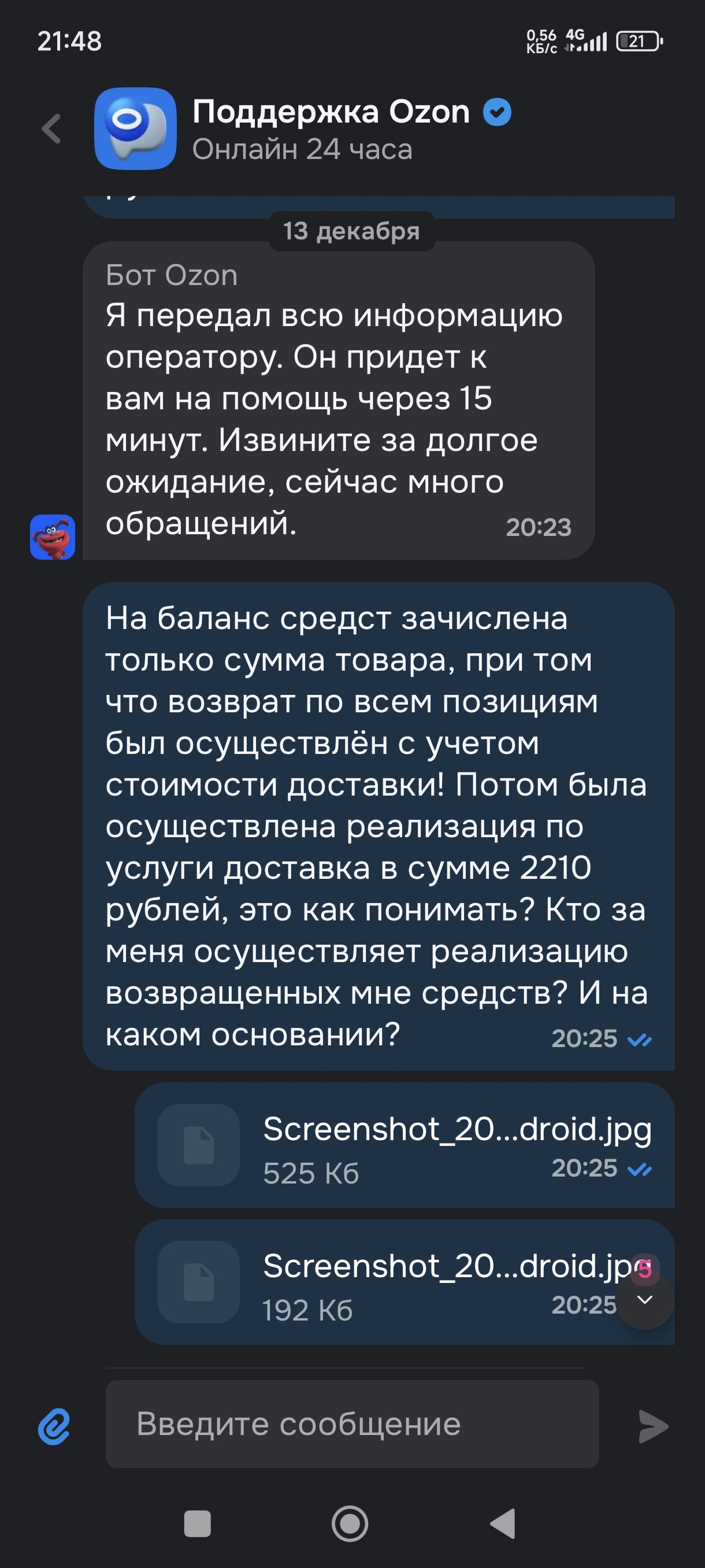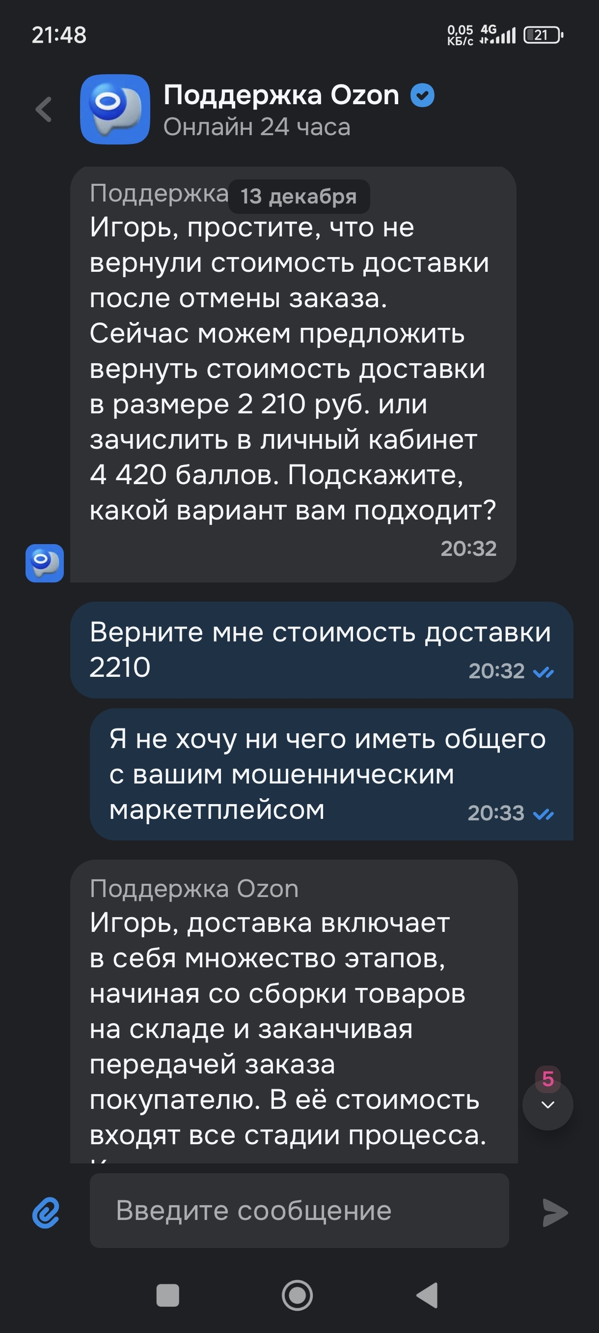 Я было подумал, что это как у Ларисы Долиной – мошенники – негодяи. Но нет, в службе поддержки мне сообщили цитирую: И(имя скрыто), простите, что не вернули стоимость доставки после отмены заказа. Сейчас можем предложить вернуть стоимость доставки в размере 2210 руб. или зачислить в личный кабинет 4420 балов. Подскажите, какой вариант вам подходит?