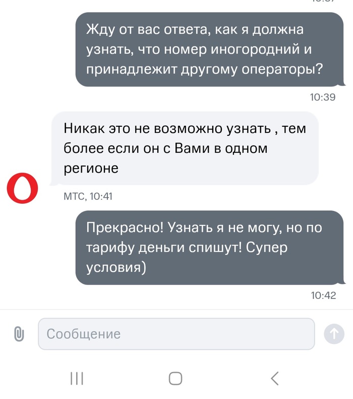 Обнаружила сегодня в личном кабинете МТС списание, которого не должно было быть. Стала выяснить в поддержке, в чем же дело. Оператор сообщила, что сняли за смс, хотя у меня подключён пакет и там ещё около 500 смс есть. Стала выяснять дальше и вскрылось очень интересное условие тарифа: смс на иногородние номера платные, и с этим можно было бы смириться, если бы не одно НО! Какому городу принадлежит номер невозможно без прямого вопроса собеседнику! Т.е по сути отправка смс теперь лотерея.