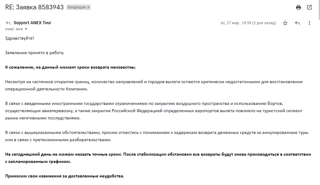И с этого момента понеслось, деньги не возвращают. Ссылаются на все что хочешь, на "военное время", тяжелое время, на большое количество таких как я, на луну в марсе. Я отправил письменную претензию, сканом и по адресу офиса, ни оттуда не оттуда не пришло ответа, по электронной почте. А так все ответы вот такие: