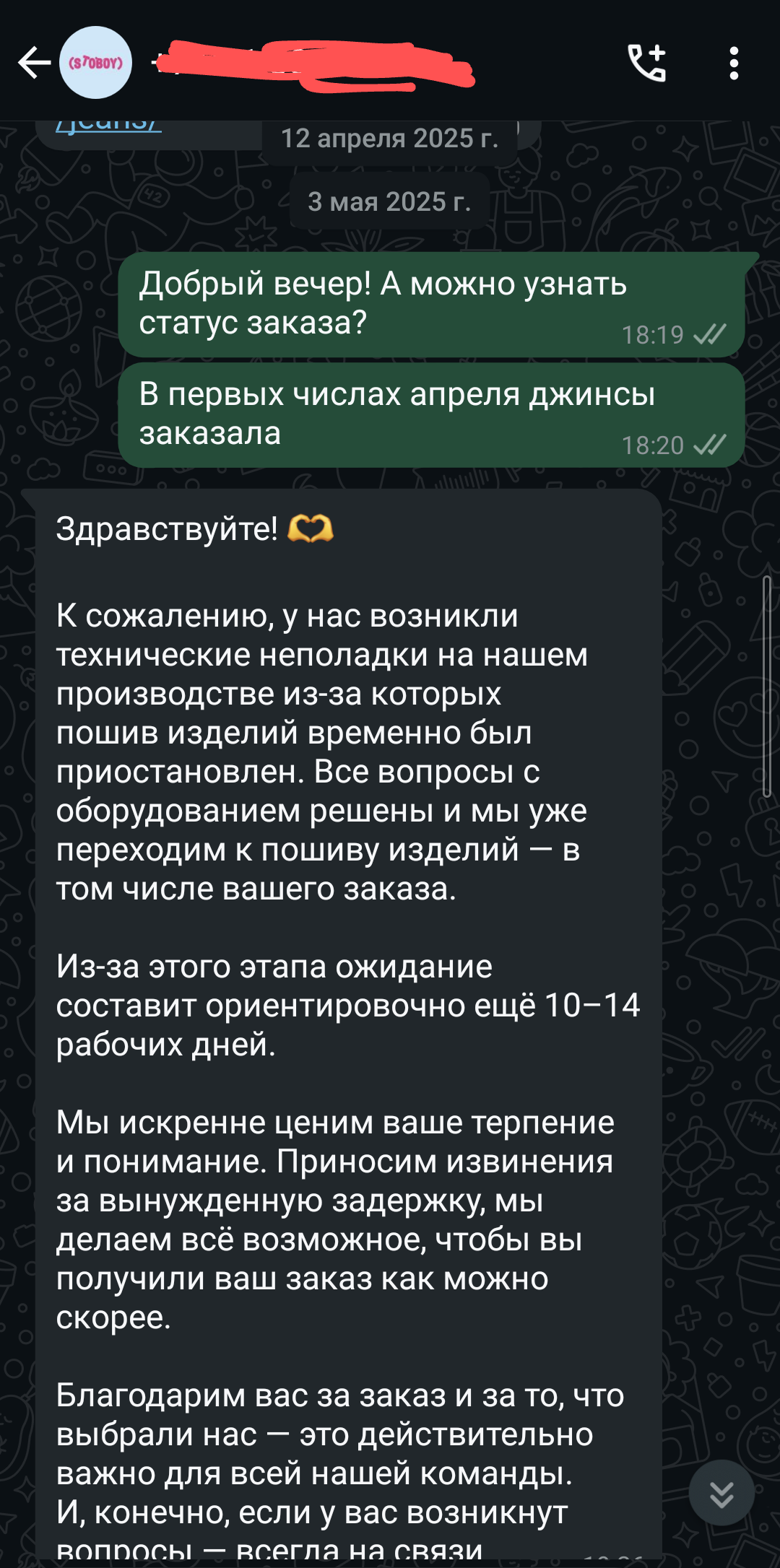 На дворе конец апреля. Ни ответа, ни привета. Решила поинтересоваться, как же дела с моими джинсами. В ответ у нас проблемы, войдите в положение.