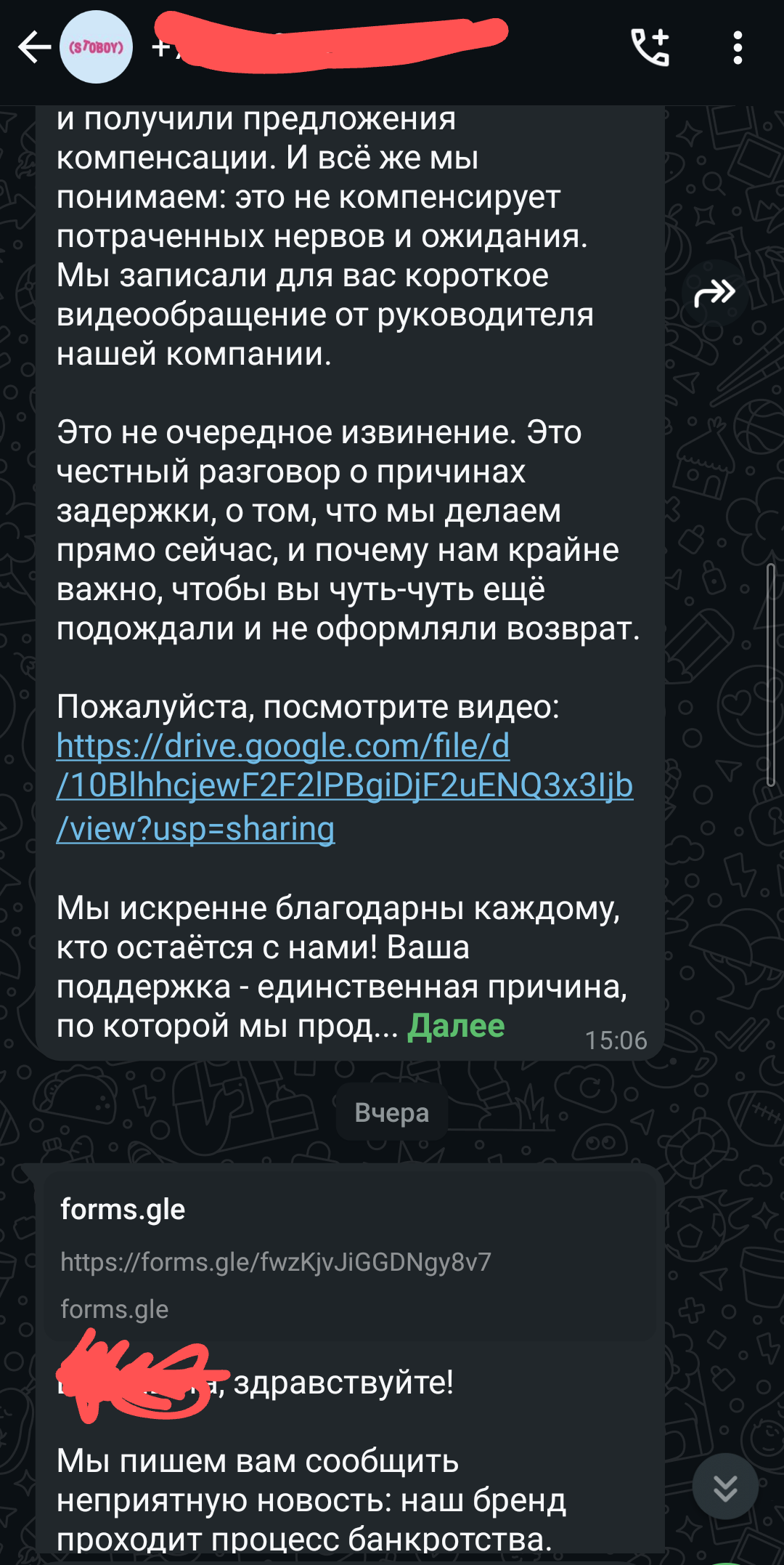 И видео от самого создателя с разъяснениями. "Мы старались, мы пытались, мы давно по уши, сами знаете в чем, но поймите нас..но мы поймём если захотите возврат. Мы принимаем заказы на новые пошивы. Мы не останавливаем производство. Если мы начнем делать возвраты - мы обанкротимся".