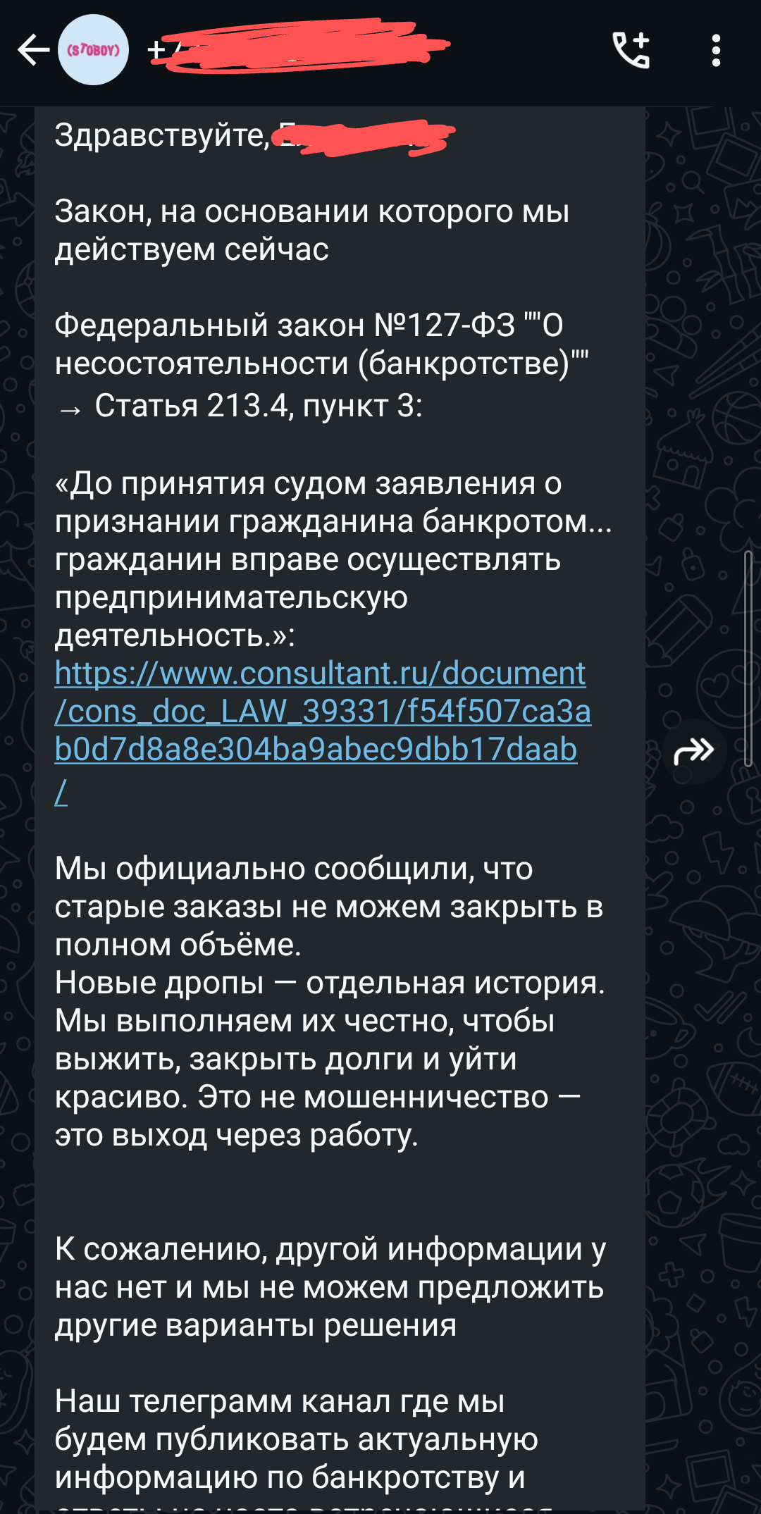 Мы официально сообщили, что старые заказы не можем закрыть в полном объёме. Новые дропы - отдельная история. Мы выполняем их честно, чтобы выжить, закрыть долги и уйти красиво. Это не мошенничество - это выход через работу.
