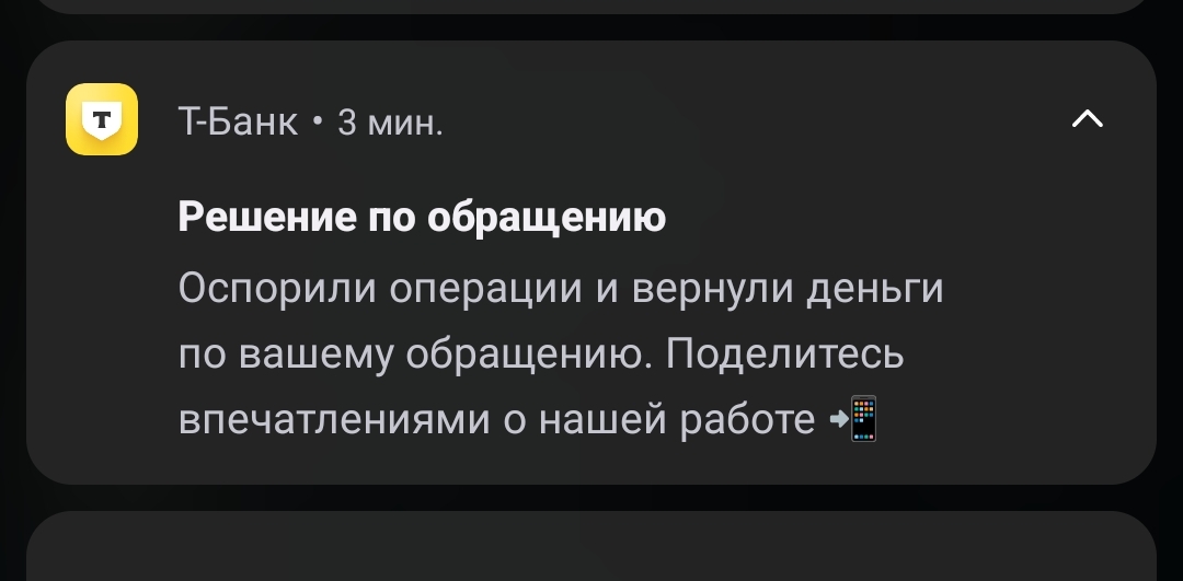 Сразу оформляю "оспорить" в приложении банка и пишу в поддержку Т2 в телеграмм. Дальше будут скрины переписки, но суть в том, что Т2 просто списывает у Вас 3тысячи на "Ваш абонентский счет для будущей оплаты подписки", хотя я даже не являюсь абонентом Т2. На все просьбы оформить возврат или обращение ответ один - "идите в офис и там оформляйте". А у меня нет времени ходить по офисам и просить вернуть мои же деньги, ошибка не на моей стороне, а Т2! В общем, мошенничество налицо, не ведитесь вы ни на какие "акции", особенно от "выгодного Т2". Надеюсь теперь только на адекватность ВТБ и Т-банка, которые помогут вернуть деньги.