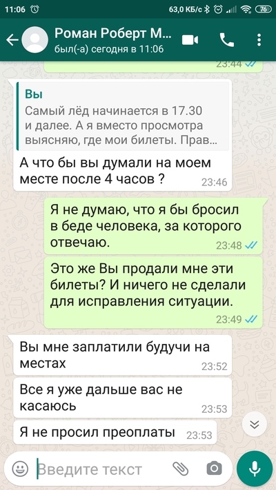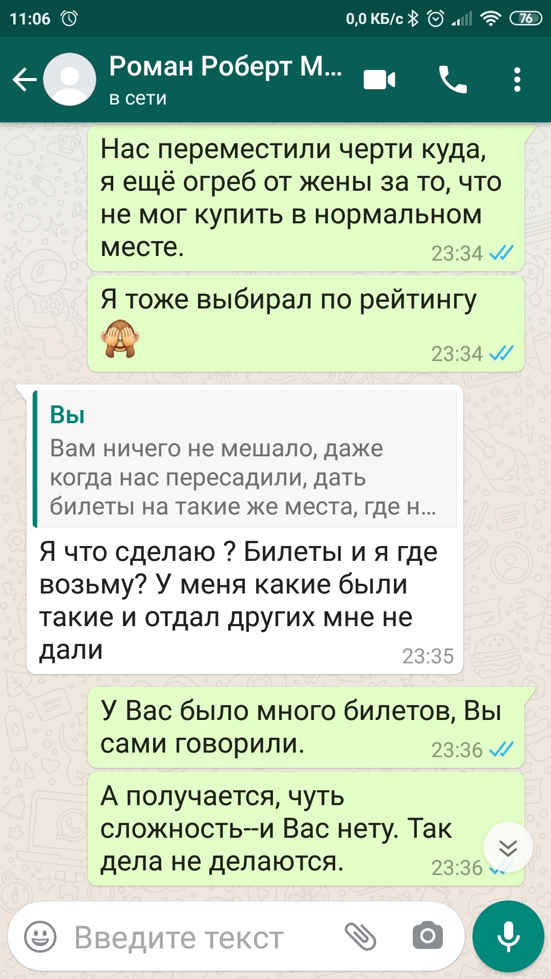 Слегка насторожил формат прохода ( первый звоночек) - он скинул скан одного билета, жена прошла, потом скинул скан второго-я прошёл. Без предоплаты. Сели на места. Места реально были неплохие. И я перевел деньги, но почему-то то Роберту (второй звоночек).