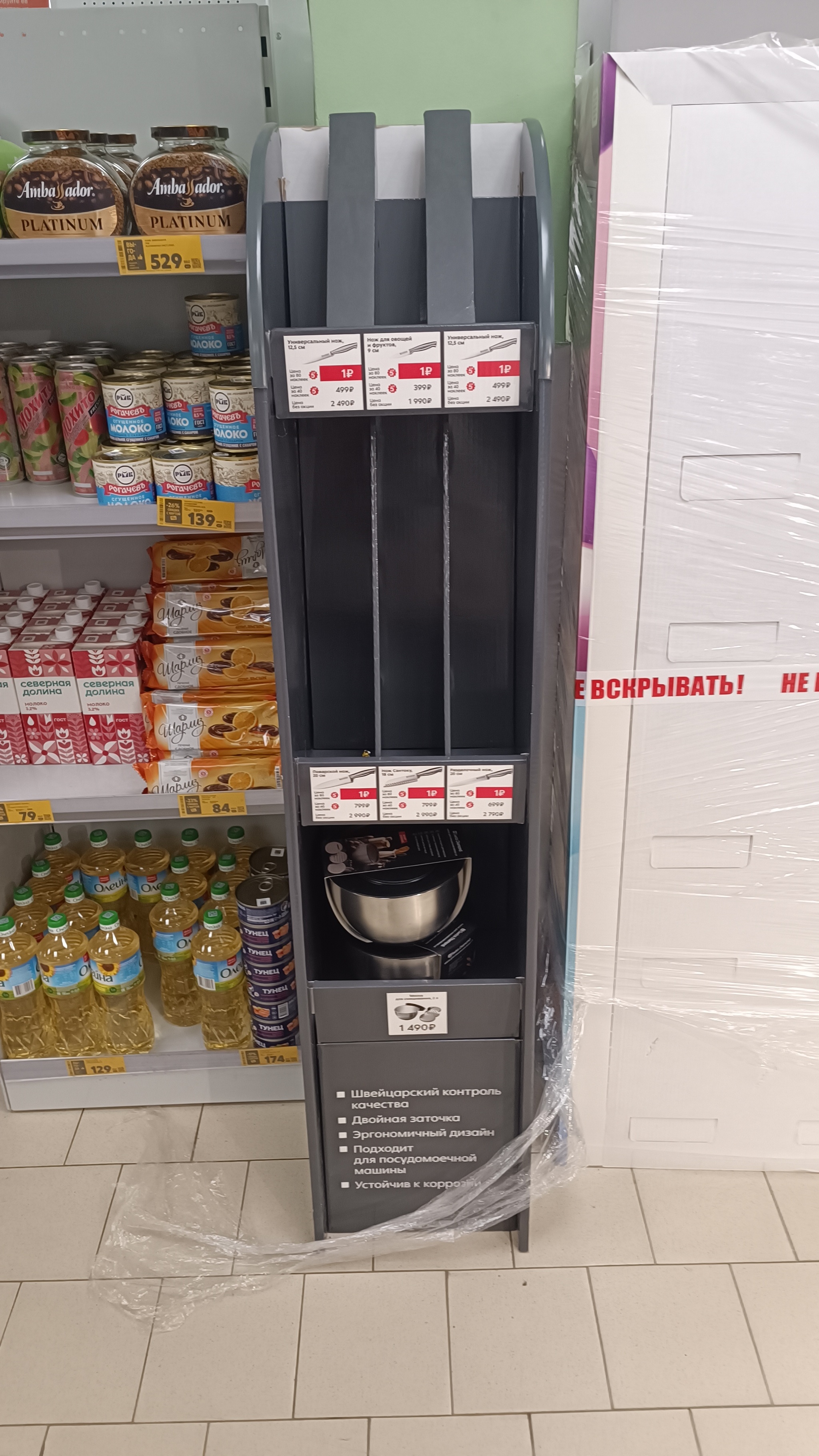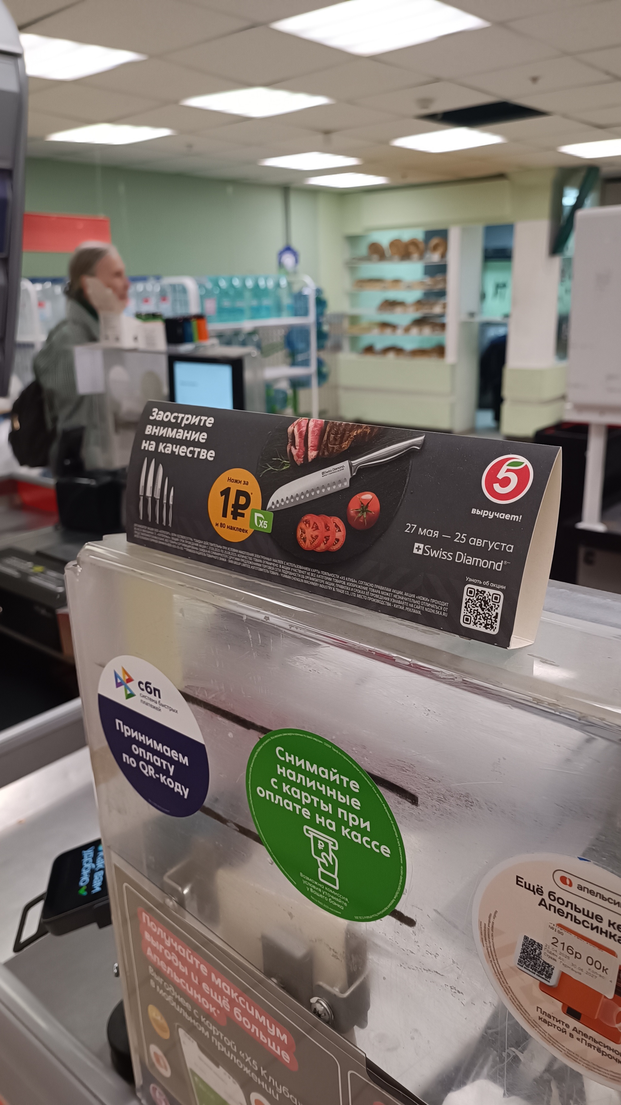 Отлично! Проверяю - у меня не хватает всего 4 звезды. Не страшно, закупаюсь на тысячу... и ничего не меняется. Звоню в техподдержку и там мне сообщают, что поменяли условия акции и теперь звёзды можно получить закупив товары партнёров. Но, по условиям акции я всё ещё могу купить нож не за рубль, а со скидкой. Иду по магазинам, а этих ножей тупо нет. Брендирование и реклама акции есть, промостойки для ножей есть, а самих ножей нет.
