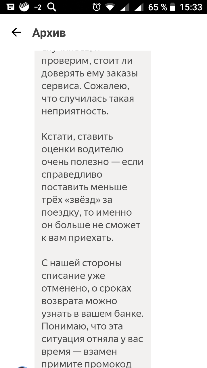Я строчу в поддержку Ятакси гневное письмо, жена вызывает такси. Погрузились, едем. Через 10 минут мне возвращаются 100 рублей и техподдержка дарит промо-код на 200 рублей.