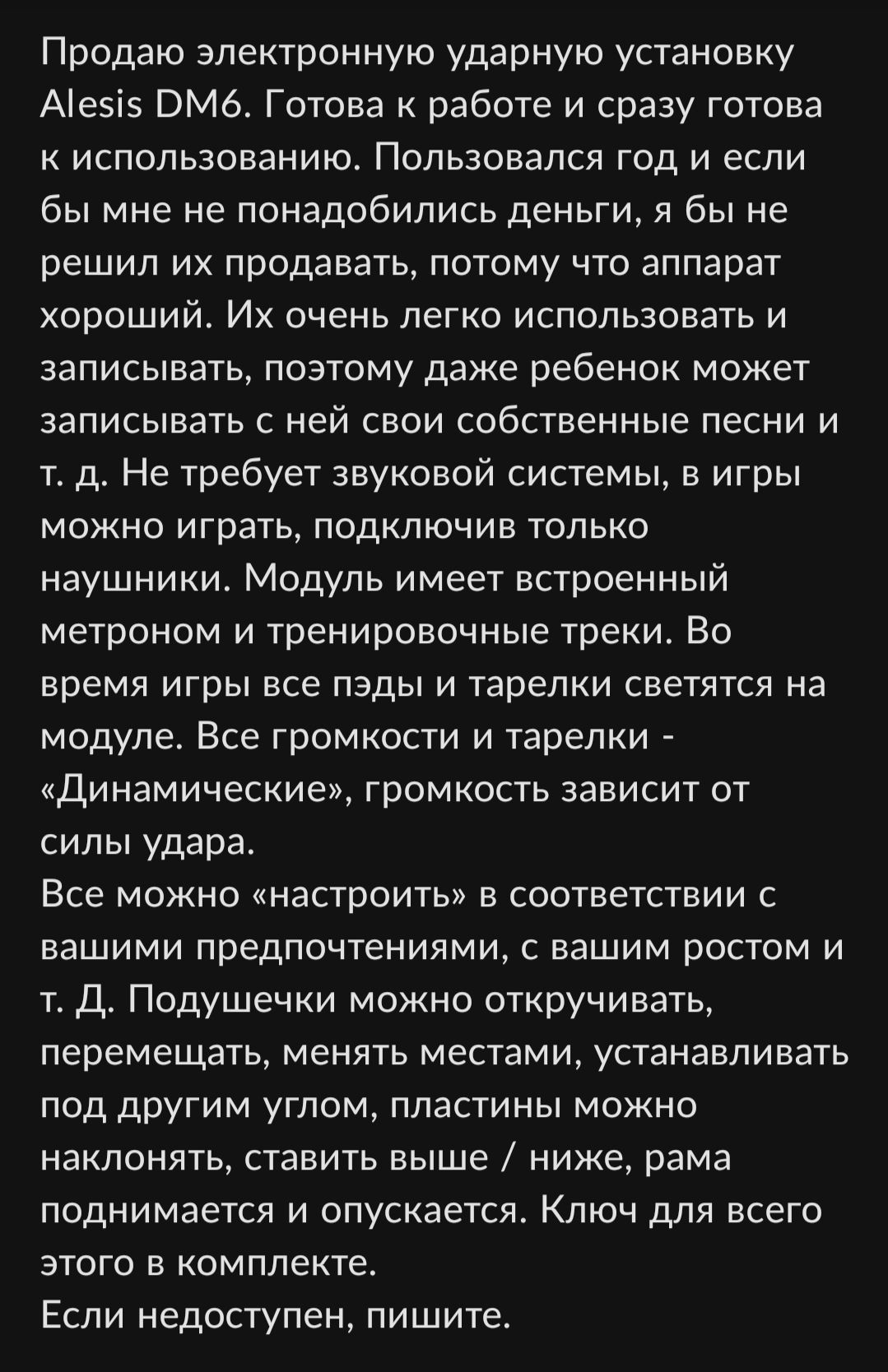 Установку обязательно электронную, дабы поставить дома и соседям не мешать. В моем уездном городе музыкальный магазин всего один, и наценка в нём подобна запросам таксистов у вокзала, а выбор сводится к "жричодали". Природная жадность же просила дешмана. Значит лезем с головой на знаменитейший сайт объявлений всея Руси, и активно там шебуршим.
