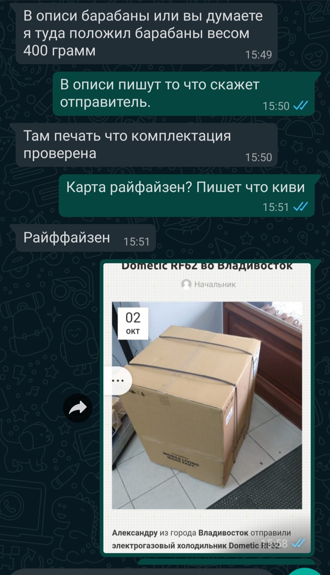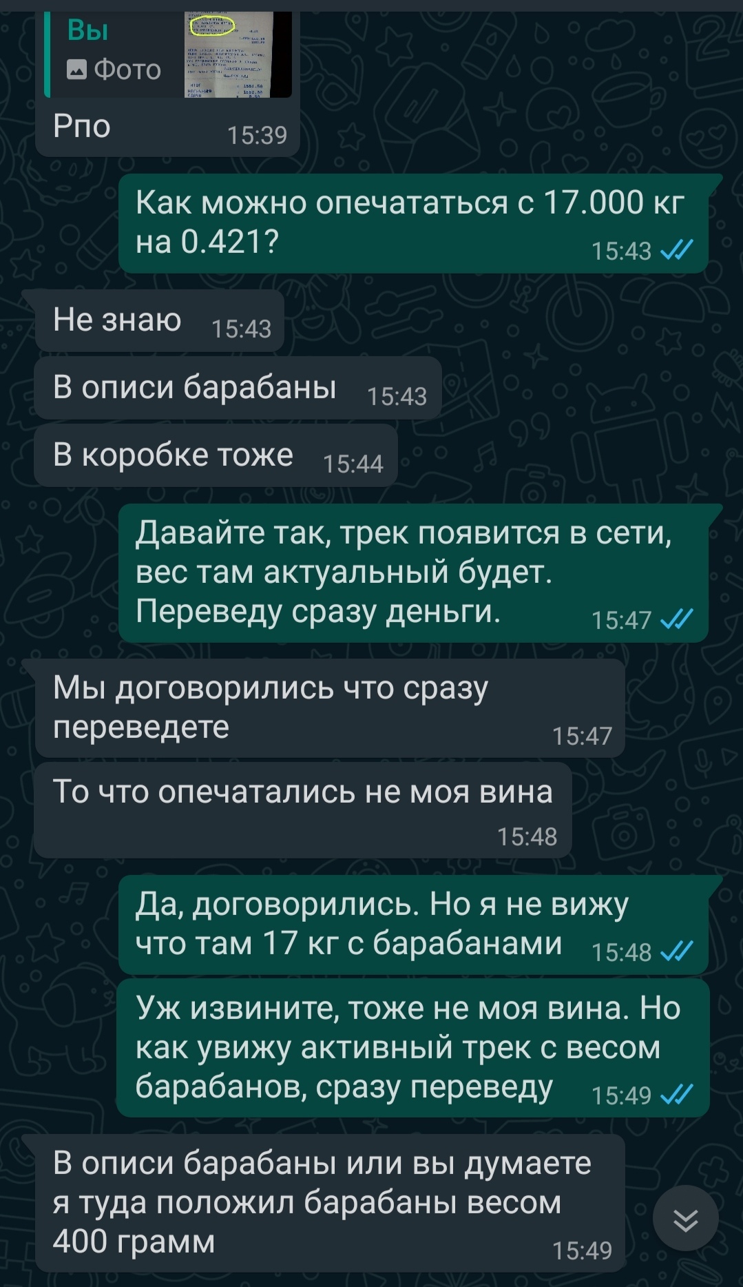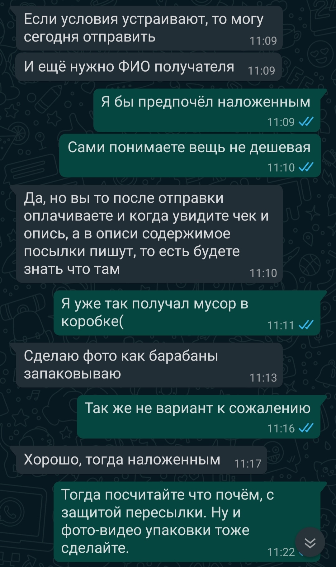 Кое-как сквозь шум космоса договорились отправить мне видео с демонстрацией работы установки. На предложение доставить мне барабаны любой транспортной компанией на выбор, тип отвечал что в его деревне такого нету, но есть почта которую он любит и всегда ей пользуется (к слову профиль зарегистрирован за день до размещения объявления, диньдинь номер 3). Дальнейшую историю, ещё несколько звоночков и ударов в набат описывают скриншоты: