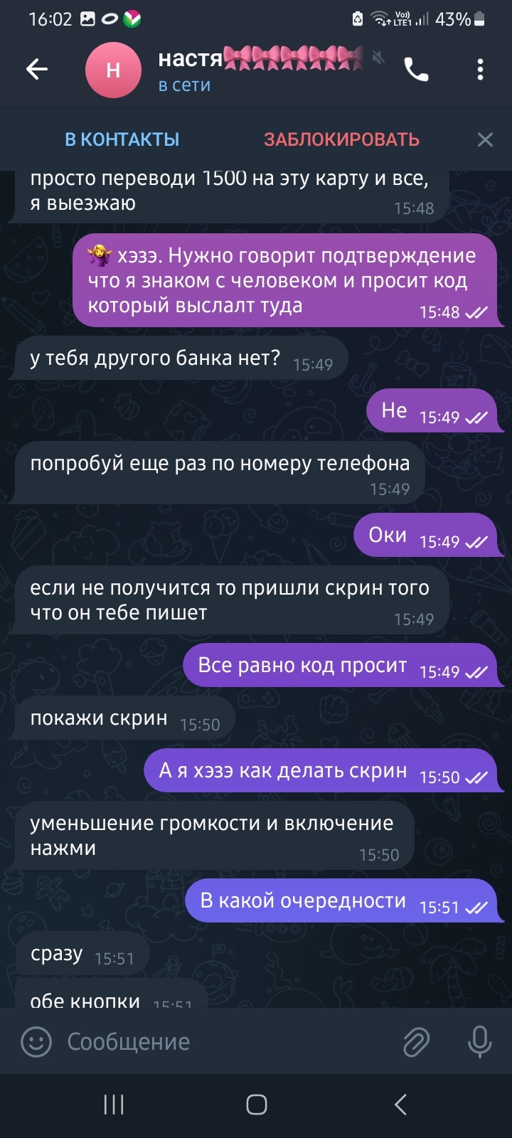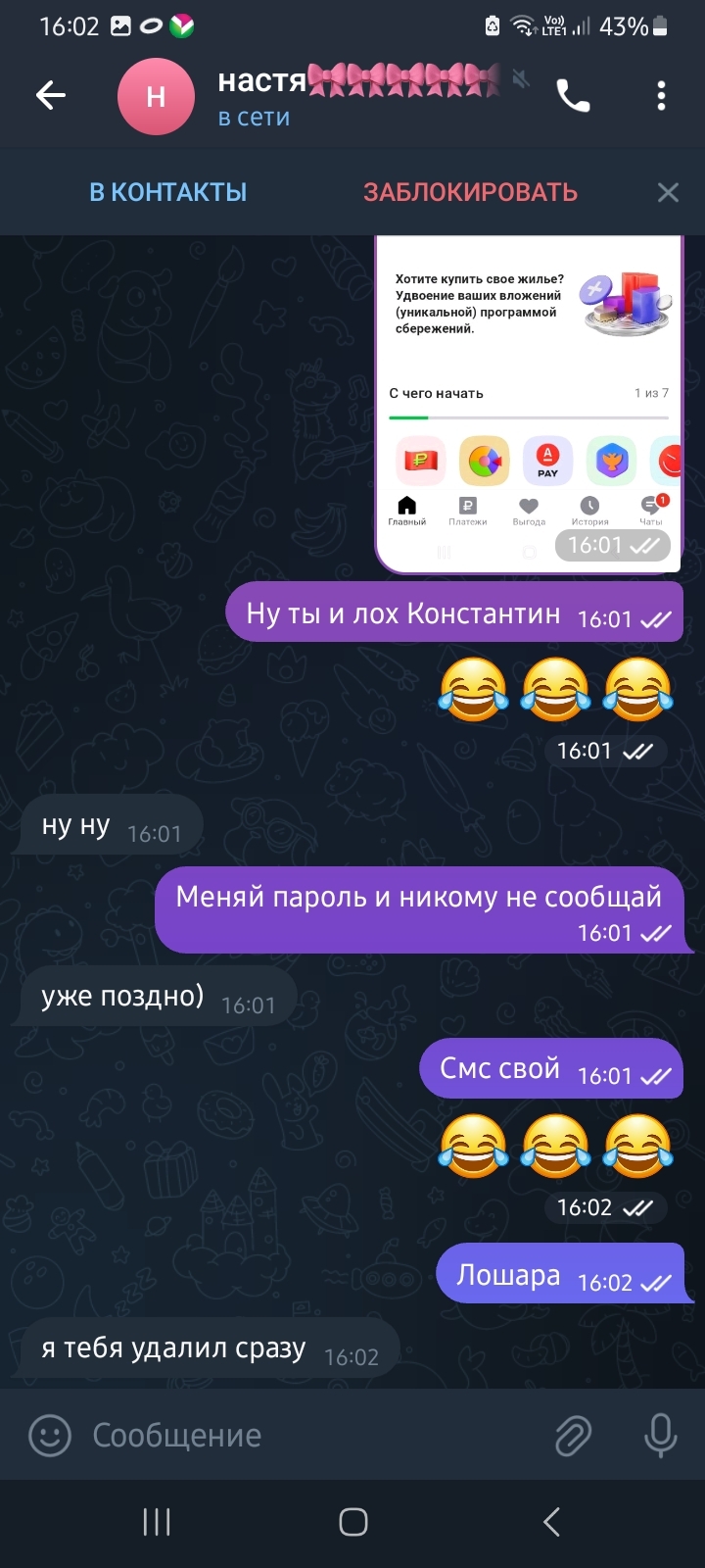 Далее просит пароль из смс, если он назовет то считай я вошёл в его онлайн банк. Продолжаем игру