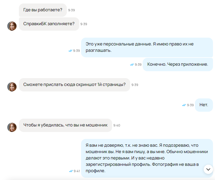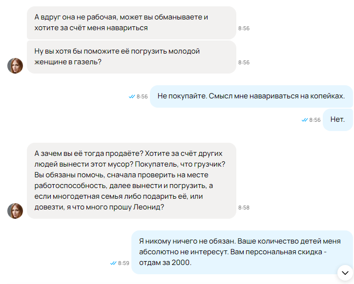 Вот скажите, что это было. Ну очевидно, что это троллинг. Я отказываюсь верить в реальное существование такого человека, с которым ни о чем можно было переписываться полтора часа. Очевидно, цель - вывести меня на эмоции, чтобы оставить негативный отзыв, чтоб заблочили объявление, или сам профиль. ЗАЧЕМ???