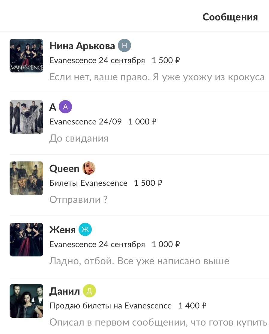 Собрался купить электронный билет на Авито на концерт за 1500 руб. на группу Evanescense. Перевожу деньги на карту Сбербанк. Билет не приходит, продавец на Авито перестаёт выходить на связь. Ничего сложного :)