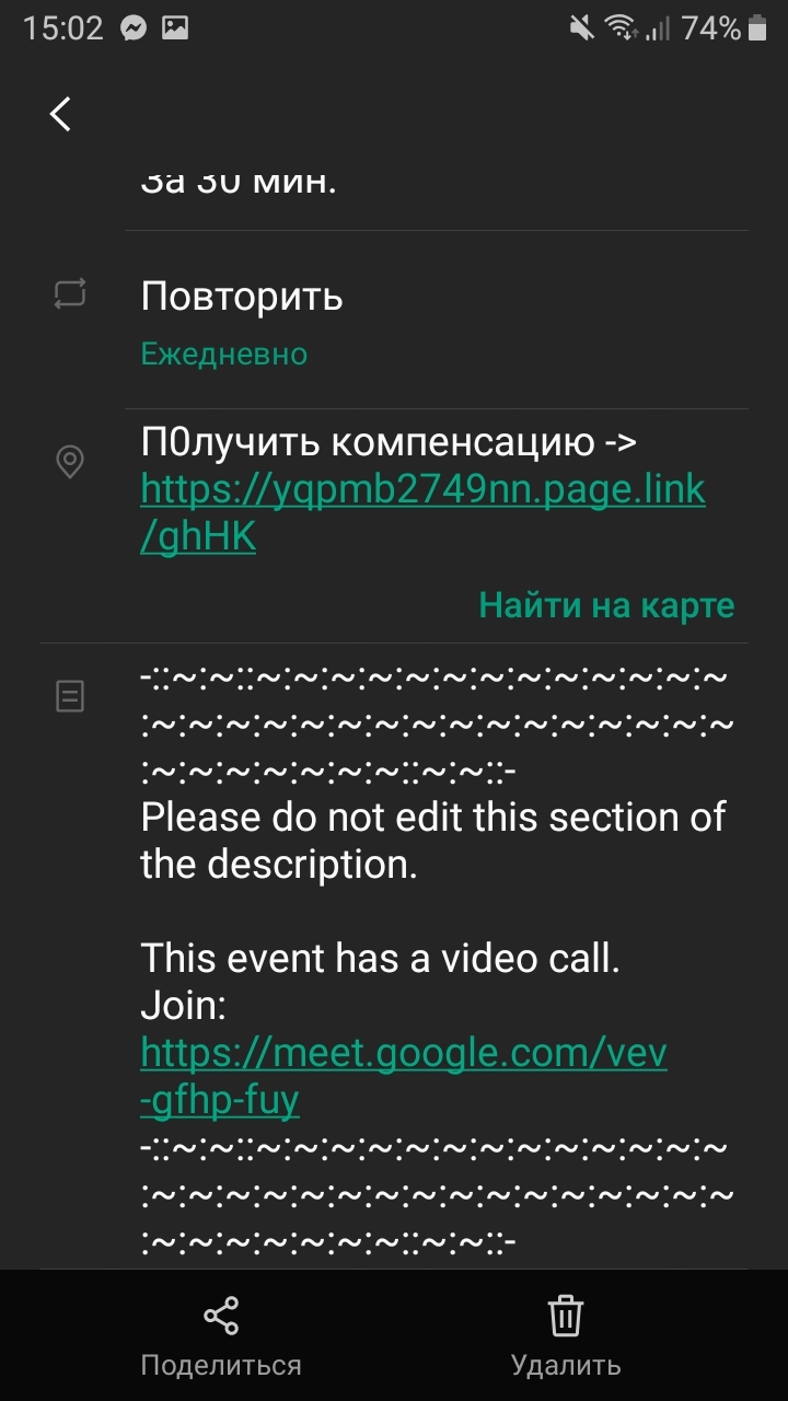 Я понятия не имею, как работает такая схема и как можно впихнуть человеку в календарь телефона мошенническую ссылку, но товарищам удалось меня удивить. По ссылкам я никаким не переходила, ничего необычного в последние дни не делала, но видимо тут как-то задействован мой эмейл.