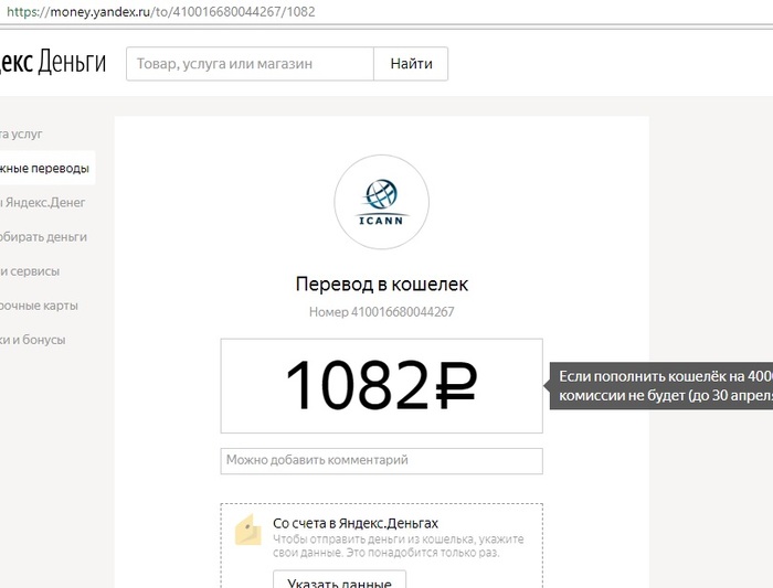 Может, они имеют в виду оплату сбора ICANN? Переходим по ссылке для оплаты и видим какие-то чудовищные 1082 рубля.