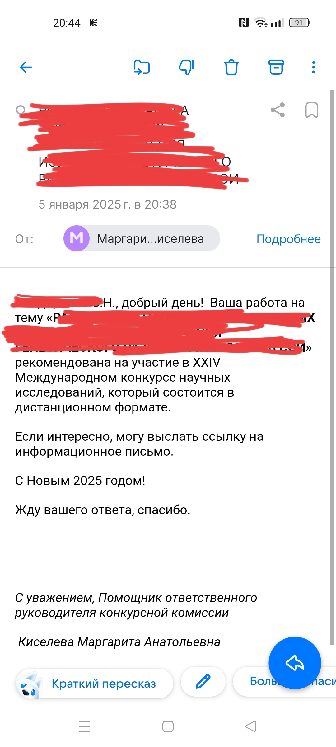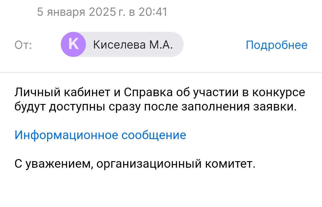 Сижу приспокойно смотрю кино, на телефон на рабочую почту пришло письмо от некой Киселевой Маргариты Анатольевны, помощника ответственного руководителя конкурсной комиссии. Интересно, думаю я.