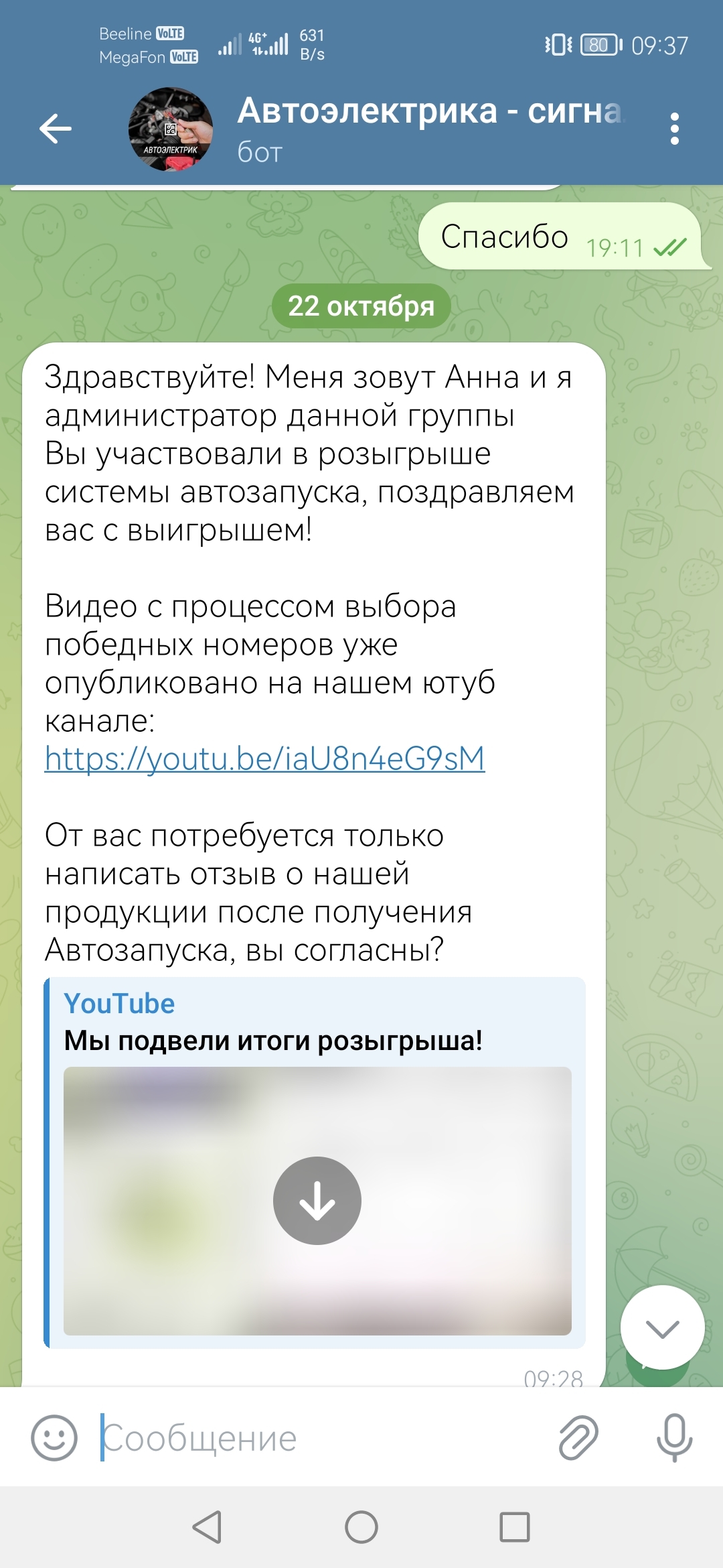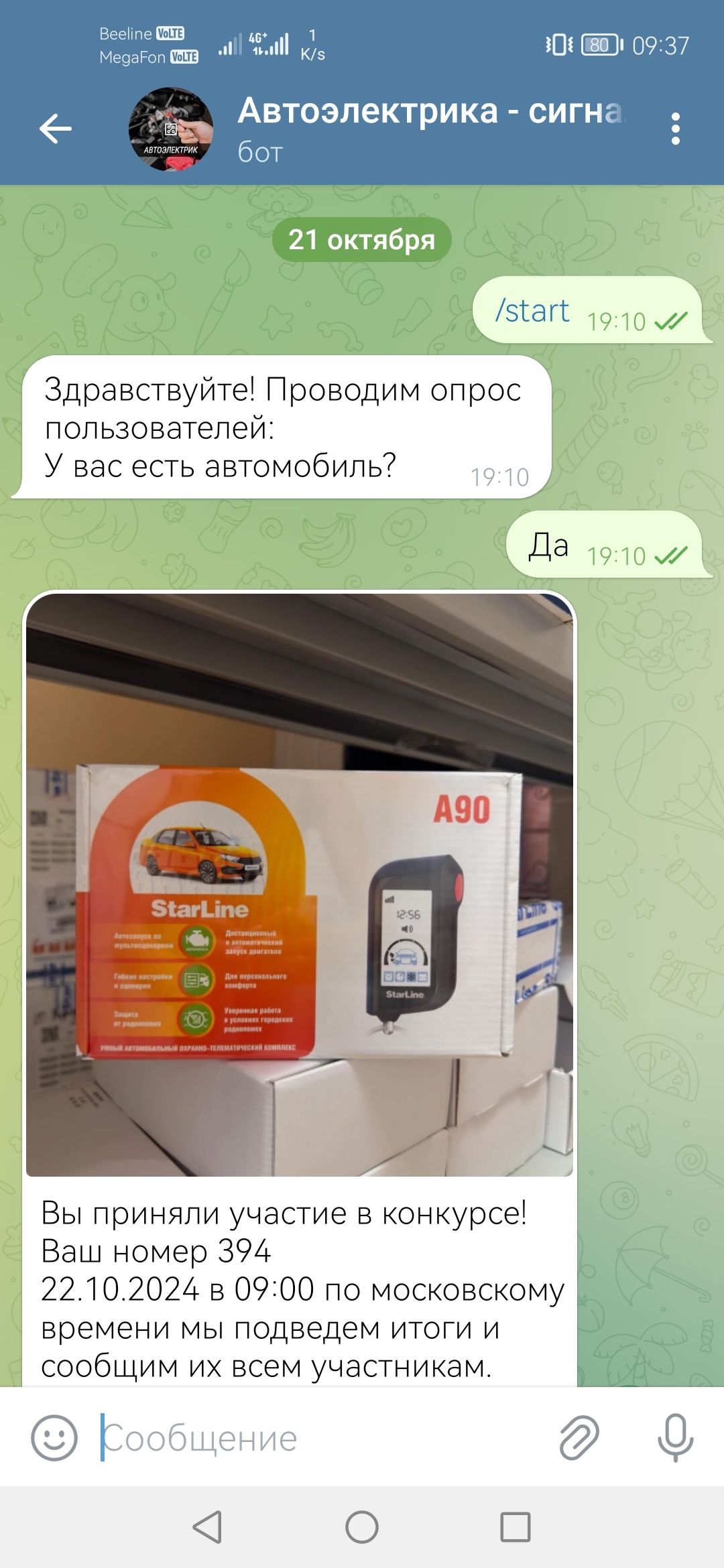 Давно думал что надо поменять старую сигнализацию на машине. То работает, то нет. Интересовался, говорят, сигналка без защиты от помех. Листал ленту ВК, увидел баннер с розыгрышем. Увы, скрин не сделал. Баннер ведёт на чатбот в ТГ. Далее картинки