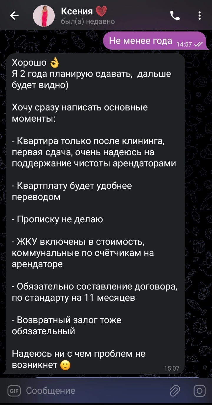 Немного предыстории: ищу квартиру для проживания, попался хороший вариант в новом доме с мебелью и ремонтом - цена немного ниже рынка, и состоялся у нас нижеследующий диалог: