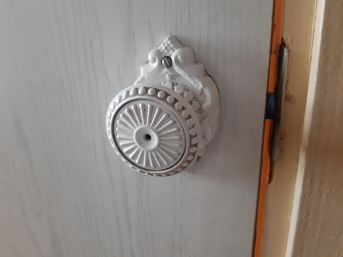 Все ручки на дверях громко щелкают, а потом легко открываются. Старьё оно и есть старьё. Ручка на двери в ванной.