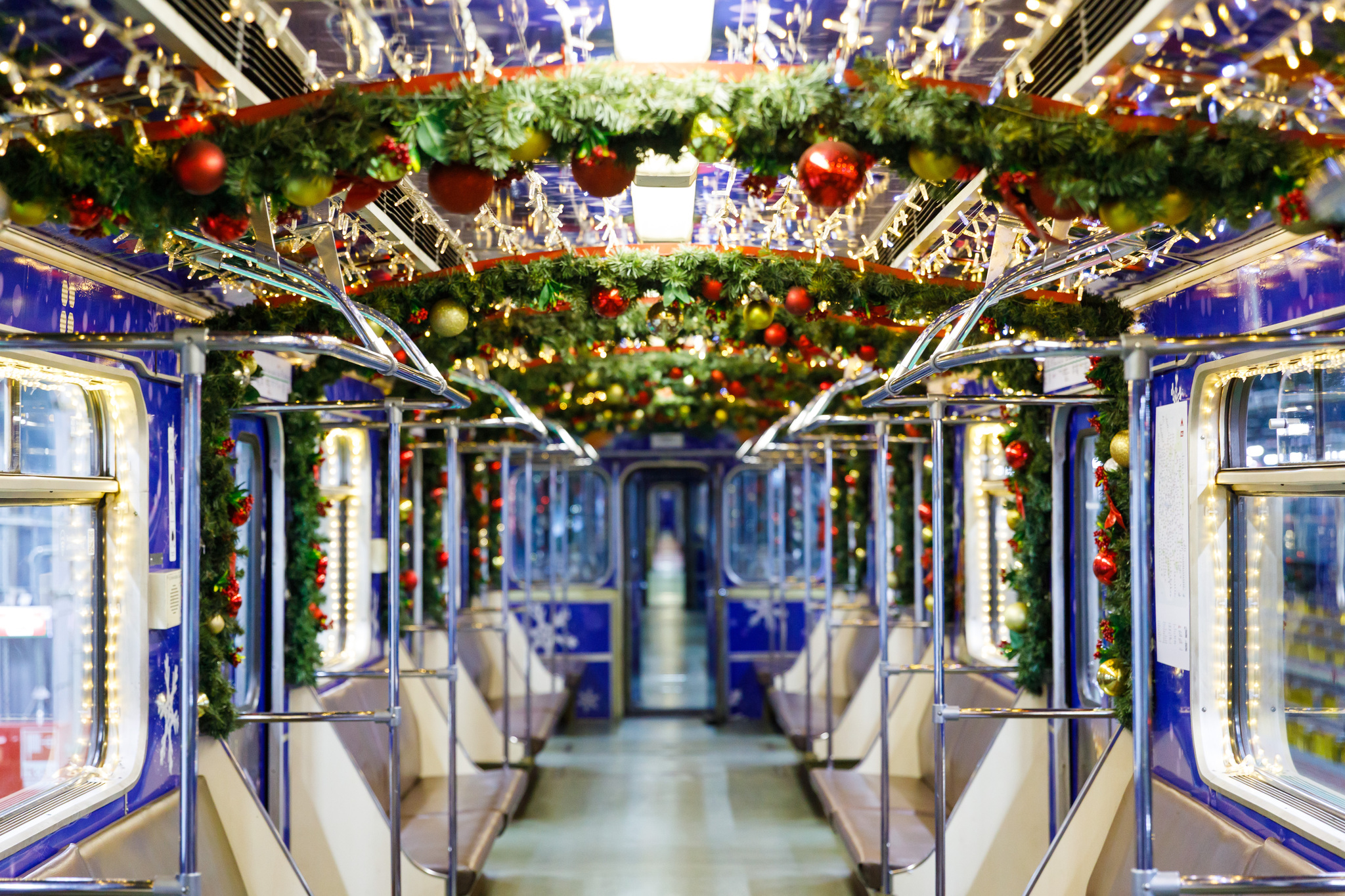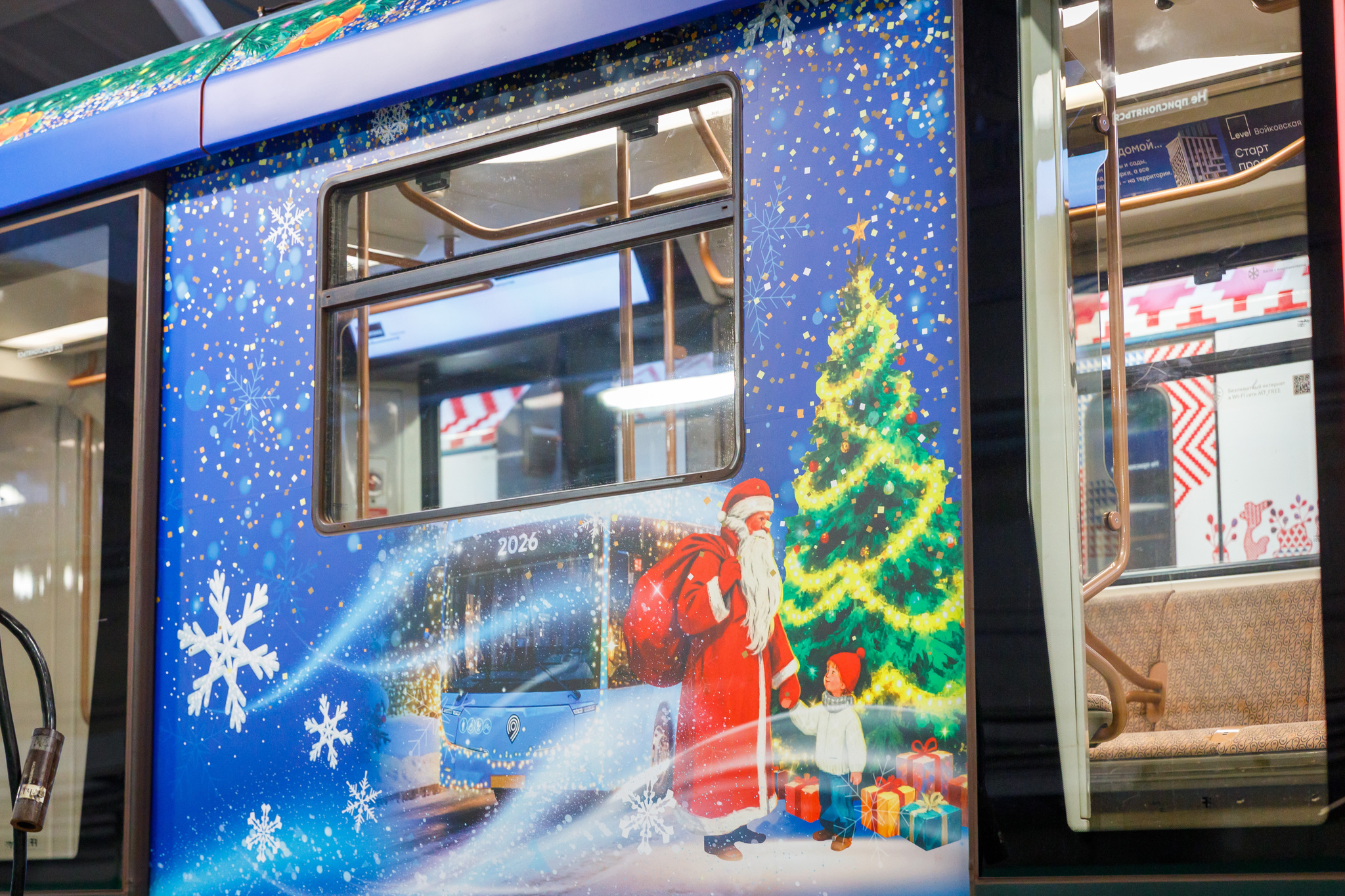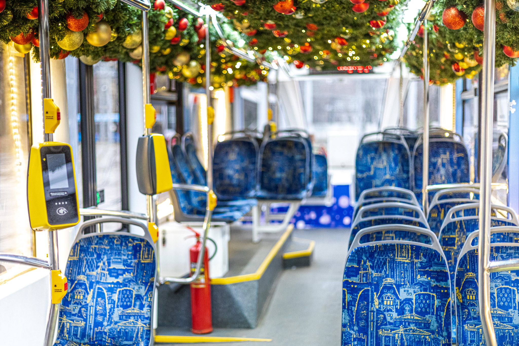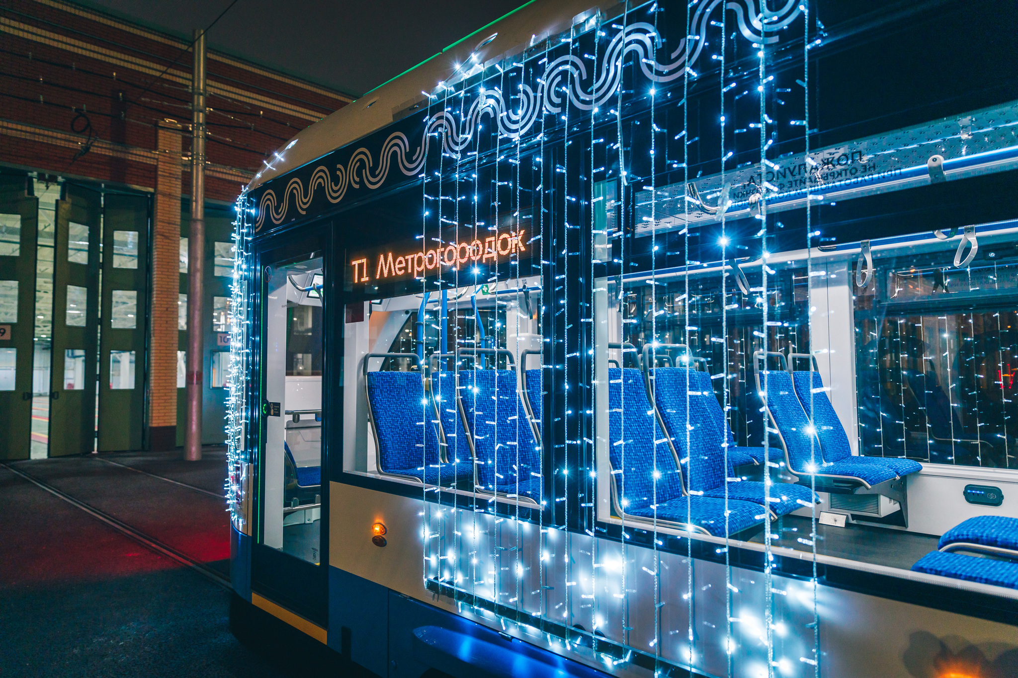 брендированный трамвай «Витязь-Москва» с хвойными гирляндами в салоне