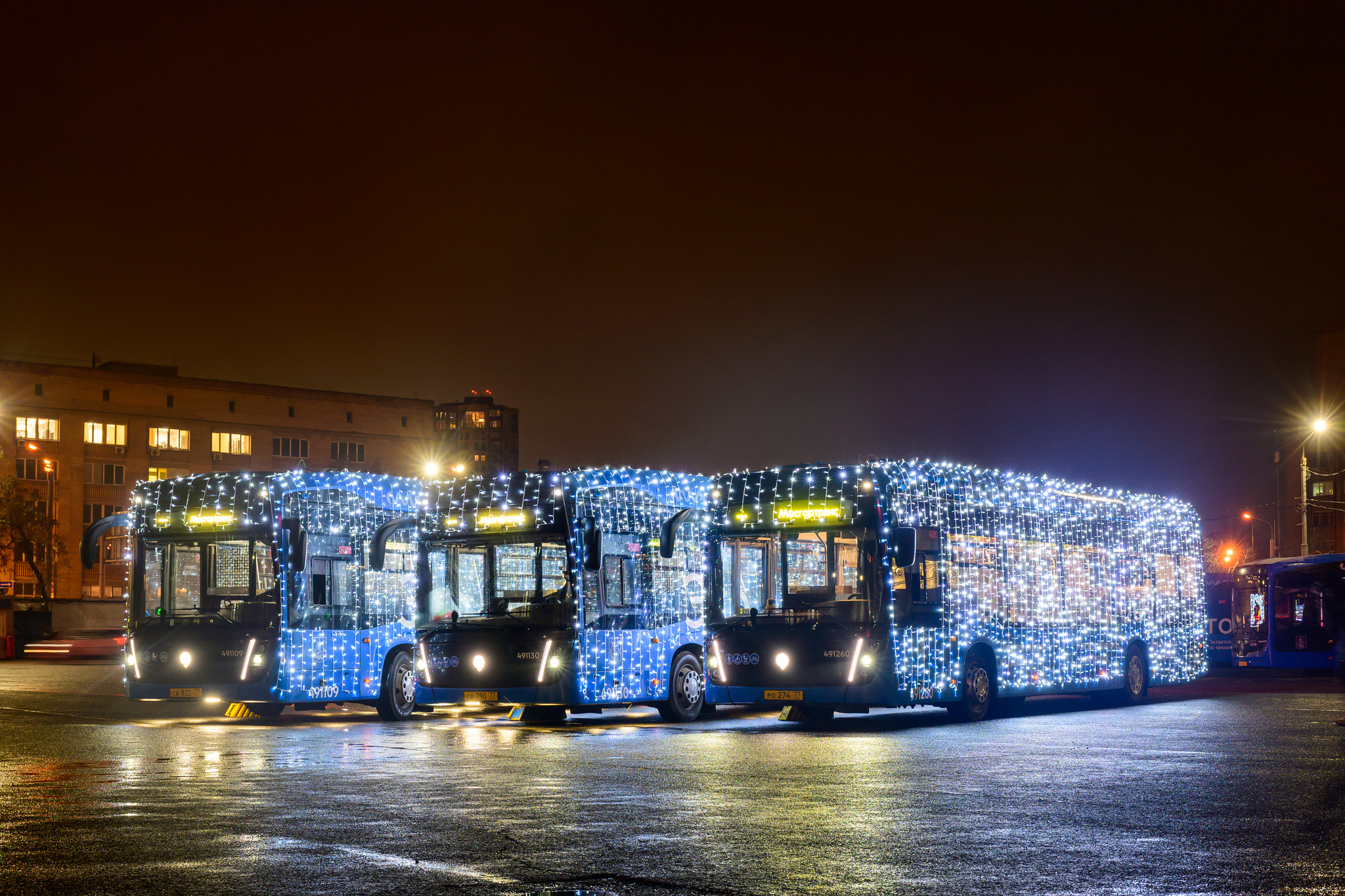 62 трамвая с гирляндами на корпусе. Из них два «Львенка» ходят по новому маршруту на Трифоновской улице, и маршруту Т1