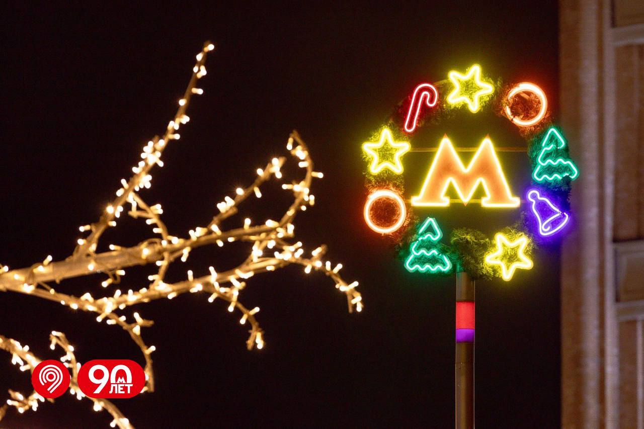🔹 Яркие неоновые композиции «М» в венке. Ими украсили входы на «Павелецкой», «Лубянке», «Пушкинской», «Китай-городе», «Третьяковская» и «Трубной».