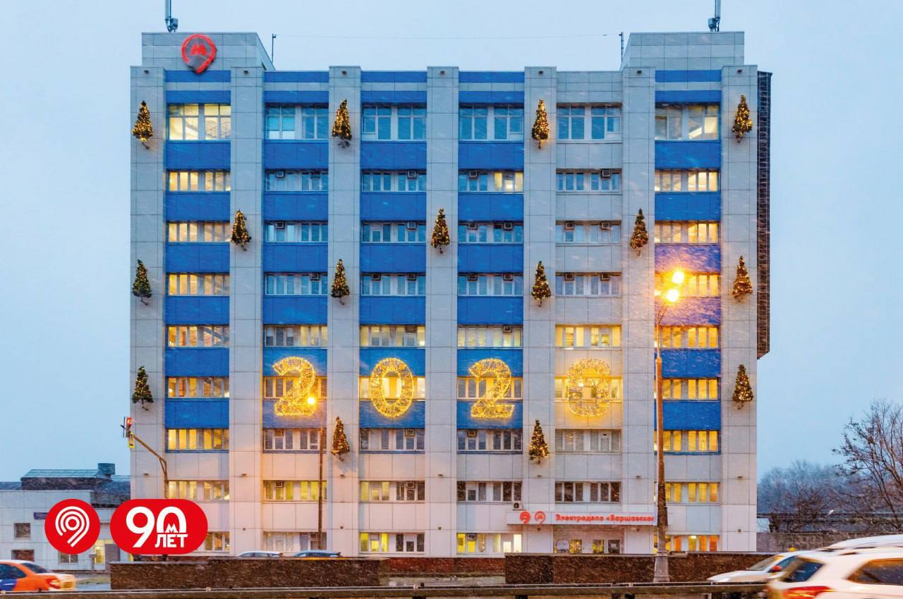 🔹 Центр перспективных разработок Московского транспорта в районе Кунцево. На карнизе закрепили 25 светящихся шаров. Они сделаны из электрических гирлянд теплого оттенка.