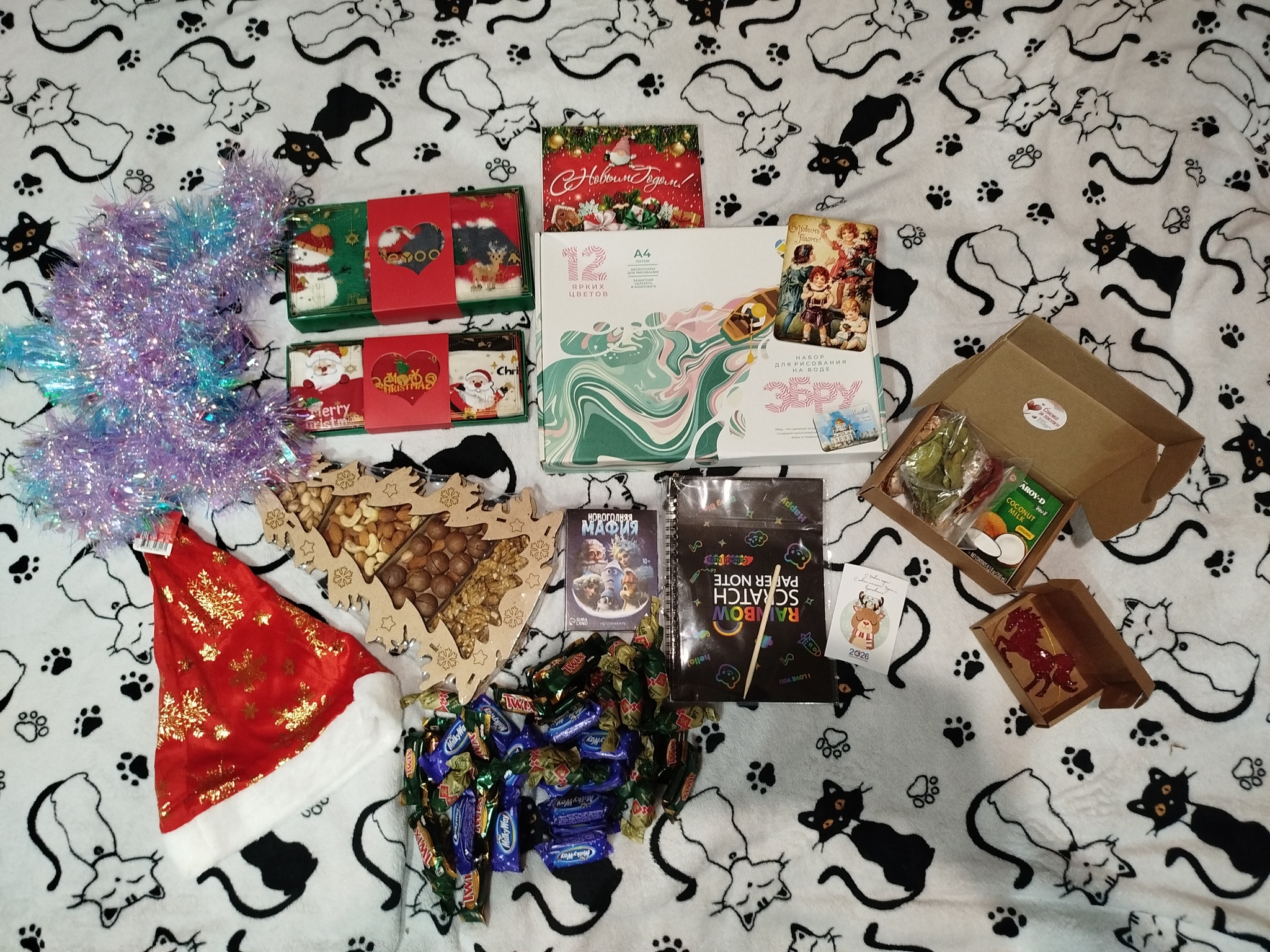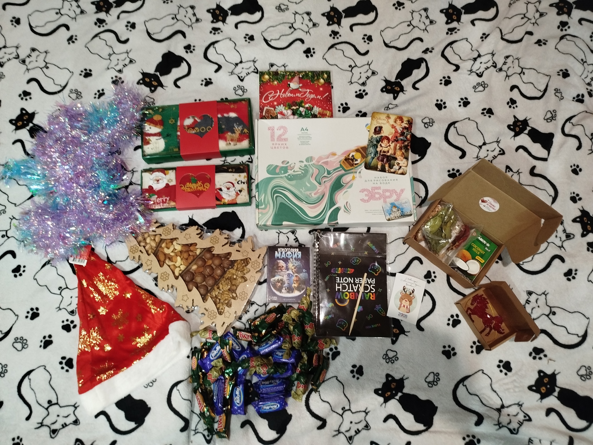 Дорогой дедушка мороз, огромное спасибо за подарок ☺️ день когда забрала посылку поднял настроение, очень крутой подарок с учётом интересов по анкете. Создал Новогоднее настроение, красивые носочки, ёлочка с орешками, конфеты. Лошадка для ёлки, магнит, настольная игра.