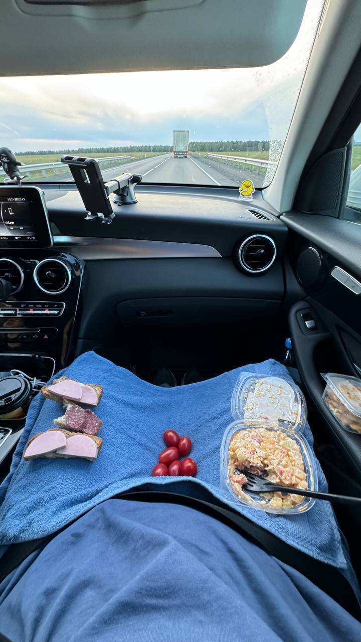 Но мы не отчаялись, поэтому решили перекусить тем, что есть в закромах прям в машине) поэтому на обед у нас были бутерброды с колбасой, тушеные кабачки и рыбные котлеты от тети Люды, помидоры с ее огорода и чай из термоса🙊❤️