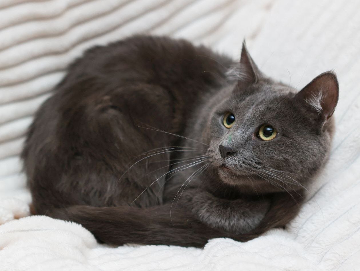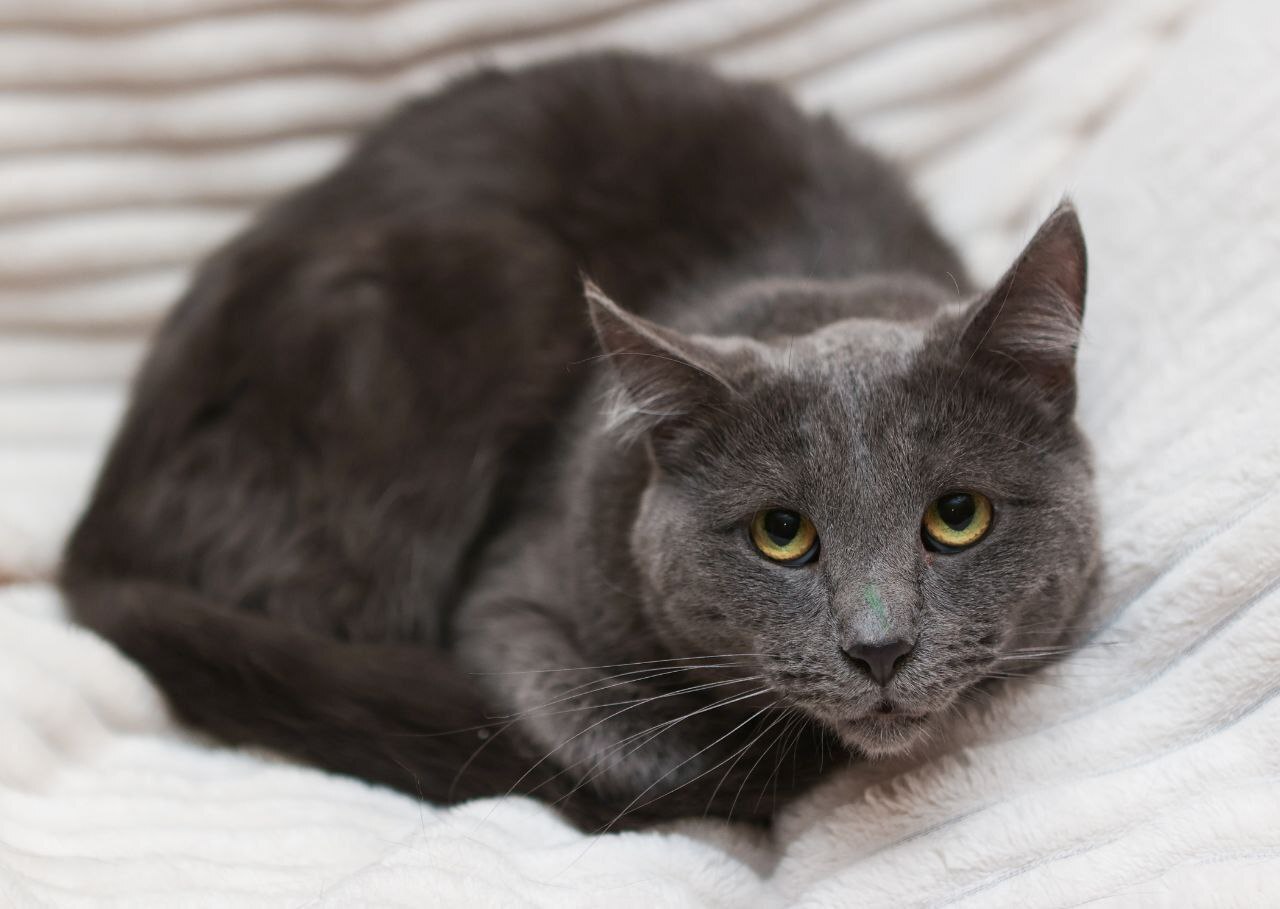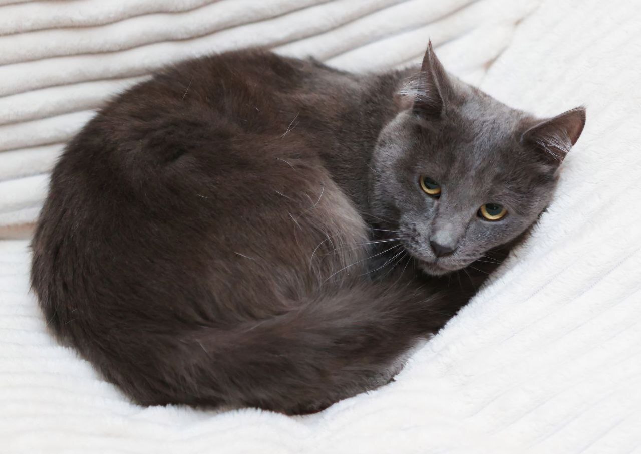 Дым — метис русской голубой или нибелунга, очень красивый большой кот. Дыму около двух лет, он кастрирован, привит, здоров.