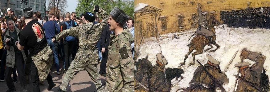 Как только казаки избили нагайками навальнистов на митинге «Он нам не царь», сразу же излился поток исторических параллелей с революцией 1905 года: известная картина Серова «Солдатушки, бравы ребятушки, где же ваша слава?» (картинка справа), прекрасные карикатуры из дореволюционных сатирических журналов времен Первой революции, яркие воспоминания очевидцев.