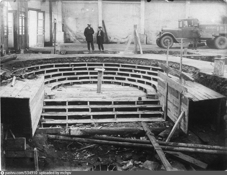 Заморозка грунта же на первой очереди применялась для укрепления плывунов, чтобы можно было на них опираться при строительстве наклонных ходов для этих самых эскалаторов. Собственно говоря, эта технология применялась давно, ещё за 100 лет до метрополитена русскими золотоискателями, а в СССР - в Соликамске и на курской магнитной аномалии, но там всё же работать надо было с вертикальными шахтами, а здесь - наклон в плывунах. Кроме того, искусственно замораживать в нашей стране не умели, а немцы, замораживавшие грунт в Соликамске в 28 году, секретами делиться отказывались, так что пришлось всё осваивать самим. Как это делалось? Бурились маленькие наклонные шахты, в них загонялись трубы с закрытым концом, а через эти трубы подавали так называемый “рассол” - охлаждённый на холодильной станции водный раствор хлористого кальция, который может оставаться жидким даже в условиях очень холодных температур. Когда становилось понятно, что грунт достаточно твёрд, что образовалась ледяная стена, начиналось строительство наклонного хода с помощью чугунных тюбингов, аналогичных тем, что использовались при щитовом строительстве туннелей (но только начиная со второй очереди). После завершения этого процесса постепенно начиналось размораживание грунта - естественное или аналогичное заморозке, только рассол был теперь тёплым. Наклонные ходы строились только на станциях глубокого заложения - Красные ворота, Кировская (ныне Чистые пруды), Дзержинская (ныне Лубянка), Охотный ряд. И несмотря на все возникавшие по ходу работ аварии (как то: прорыв плывуна на Кировской из-за неработавшей трубы заморозки, постоянные трещины домов), строителям сопутствовал успех, хотя и со срывом сроков.