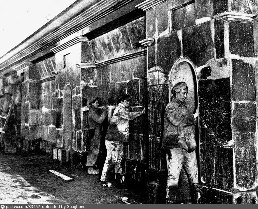 Рабочие укладывают грузинский мрамор шроша на станции Красные ворота