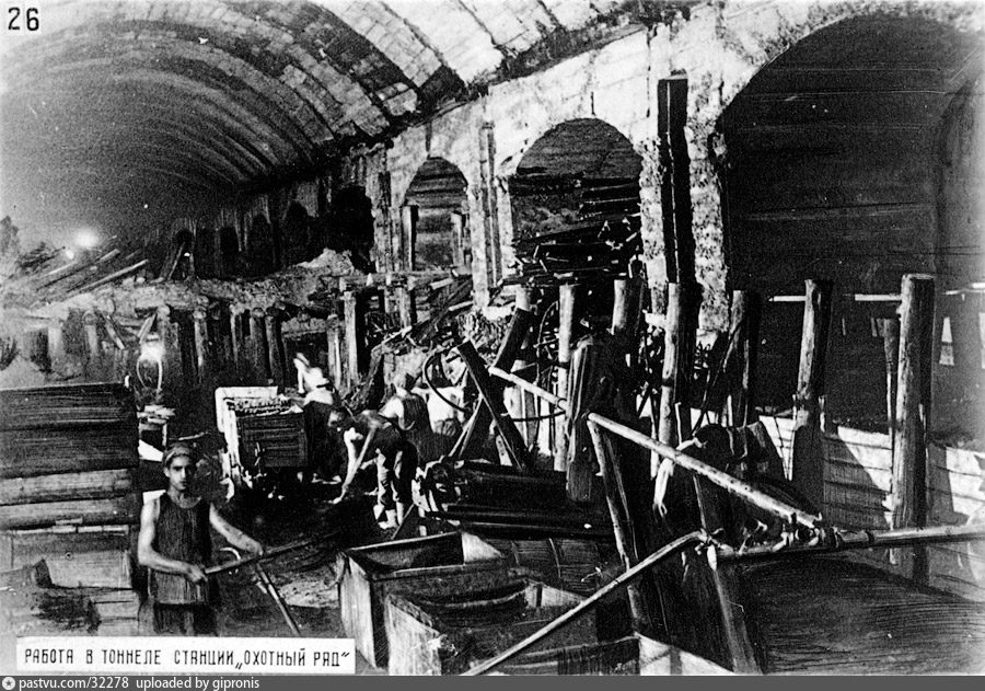 Станция Библиотека имени Ленина хотя и расположена неглубоко (от свода до поверхности всего 2-2,5 метра), но строилась закрытым способом, так как Каганович запретил перекрывать Моховую улицу. Сначала здесь сделали низ станции, залив монолитным бетоном, а затем - свод бутовым камнем, после чего выбрали внутренности.