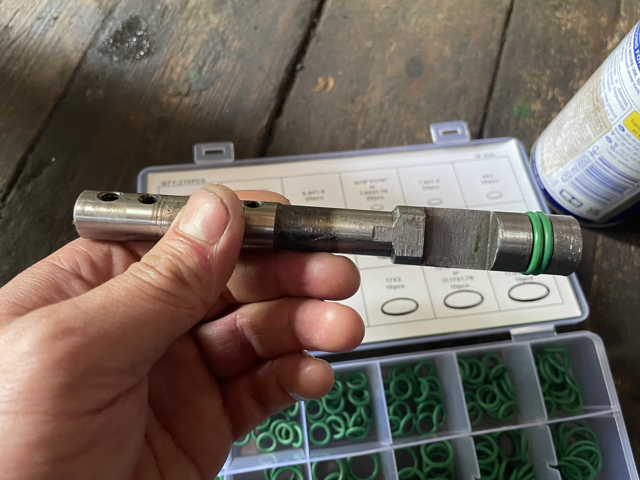 Длинный вал, который вы видите над этой строчкой собирается обратно без особых проблем, только смазать маслом его и посадочные места. А вот маленький с паразитной шестерней надо ещё помучиться. В чём проблема? Да в том, что при установке обратно, он постоянно пролетал мимо своего места и когда это происходило, новые резиновые кольца частично срезаются . Три раза я разбирал этот узел, пока не вставил упор в виде длинной головки на 17