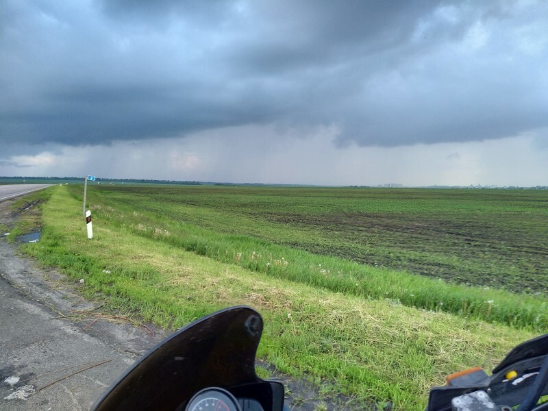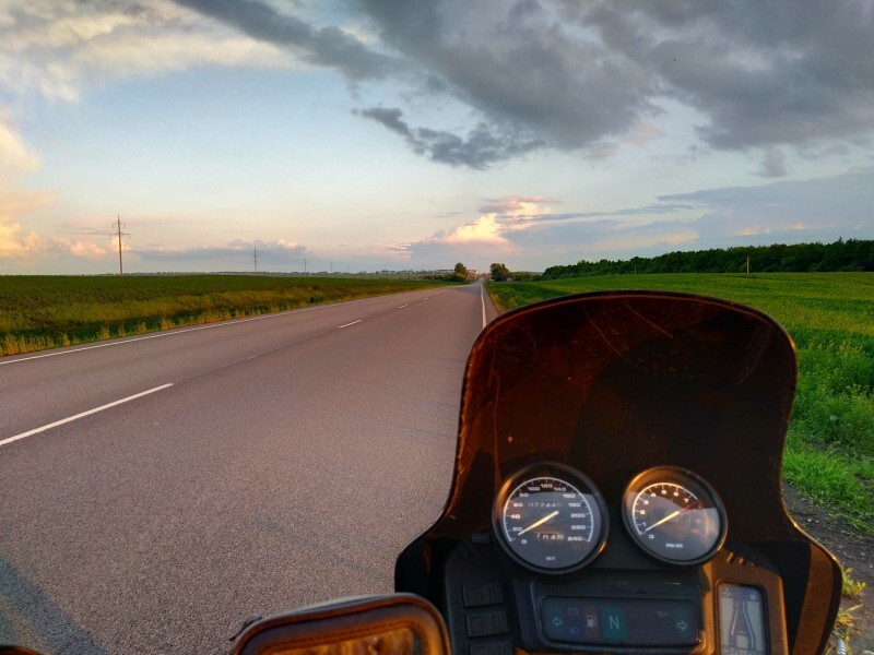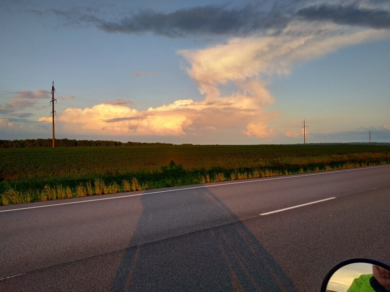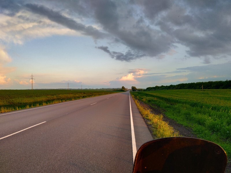 После Воронежа началась идеальная дорога: солнце, тепло, идеальный асфальт, немного машин, почти нет населённых пунктов и камер. Ехал и радовался всему что видел. Когда бак начал обсыхать заехал на какую-то белорусскую заправку, где был подозрительно дешёвый бензин. Успокаивало, что поток машин на ней был большим, значит скорее всего качество нормальное. Пока жевал бутерброды с чаем, подошёл дедушка и внимательно стал рассматривать мотоцикл. От чая и бутеров отказался, сказав, что ему очень интересен мотоцикл. Поговорил с ним о разных движках, подвесках, Союзе и отечественном автопроме. На этой позитивной ноте попрощались, и я двинулся дальше. После Курска началась красивейшая дорога с серпантином и отличным асфальтом, в какой-то момент я понял, что впереди нет ничего светлого, сплошное чёрное месиво.