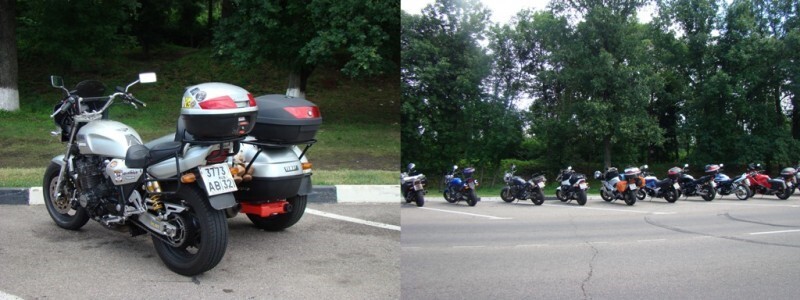 Перекусили на лавочке в тенёчке (солнышко уже раскочегарилось не на шутку), оделись и поехали. Буквально через несколько километров приехали в новый парк, рядом с которым расположилась целая процессия! Судя по моделям это какой-то клуб поклонников Yamaha XJR 1200. Один выделяется особенно: с коляской, канистрой и автомобильными покрышками =) Красотень! Себе такой захотел.