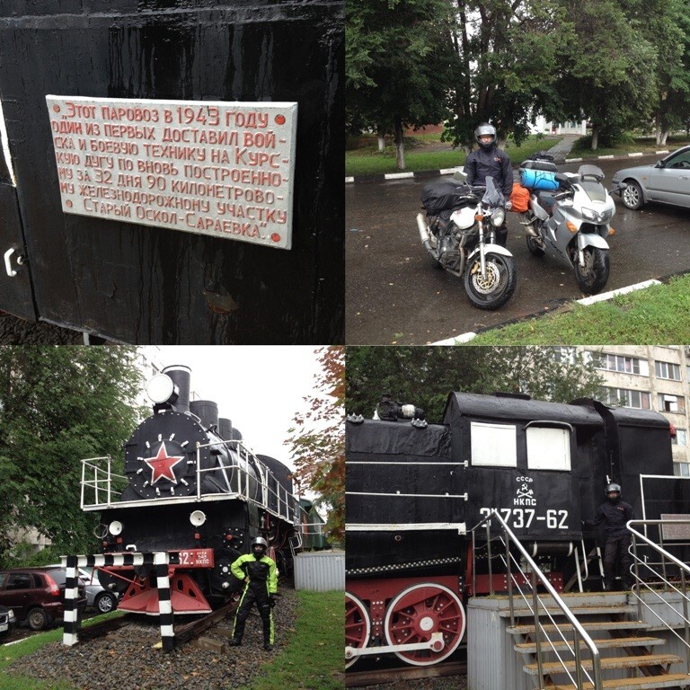 В этой поездке мы испытали свои дождевые чехлы, которые до этого времени больше укрывали мотоциклы от лишних взглядов нежели от непогоды. И они потерпели полное фиаско! Они протекли по швам, вещи под ними отсырели или даже откровенно намокли. Поэтому в Курске, когда мы подъехали к «Триумфальной арке», пришлось развешивать вещи, чтобы они хоть немного подсохли. Бульвар очень понравился, на нём много деталей, так или иначе причастных к ВОВ, поэтому настроение передаётся на подсознательном уровне.