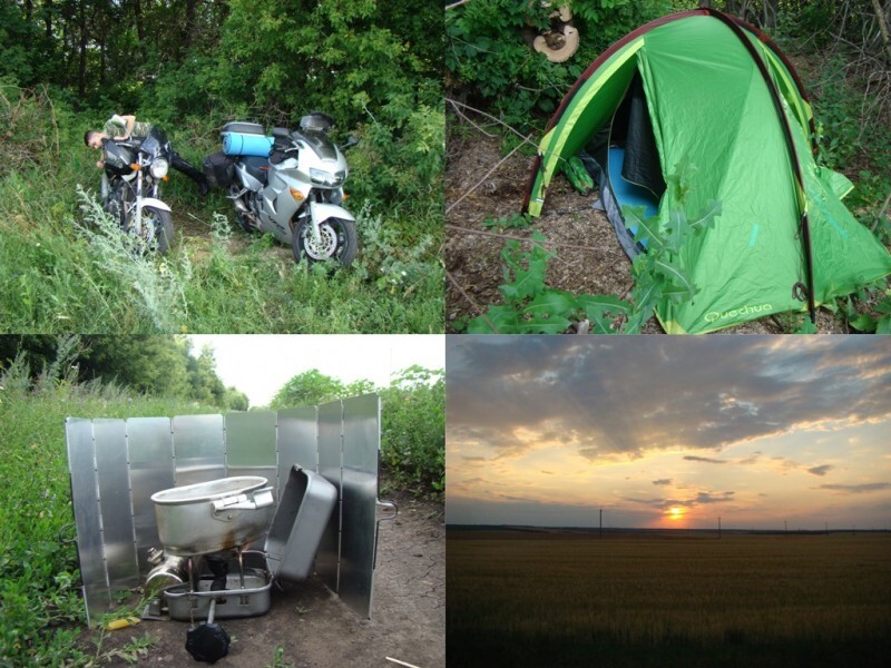 Однажды проехав около 800 км за ночь, понял, что ночью на мотоцикле ехать — то ещё удовольствие. Поэтому, когда начинало темнеть, сразу искали место под палатку. Распаковали вещи, поставили палатки и приготовили ужин. Это явно приятнее, чем делать тоже самое, но при свете фонарика и неизвестно где. Из Липецка до места стоянки прошли около 270 км, и встали в какой-то посадке недалеко от трассы. Погода отличная, тепло, комаров мало. Всё время хотелось так путешествовать, но постоянные «жёсткие рамки» вынуждали отказываться от такого варианта ночёвки.