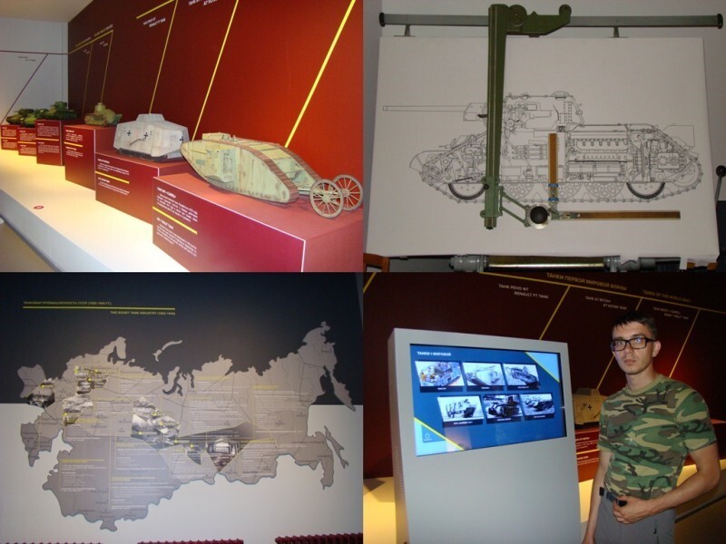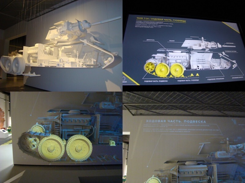 В одном зале подвешен макет танка Т-34. Напротив него на постаменте есть дисплей. Нажимаешь на нём на какой-нибудь элемент танка (например, броня) и тебе на экране подробное описание. Потрясающе! Если я в 27 лет так радовался всему этому, то буду школьником вообще бы не ушёл из музея =)