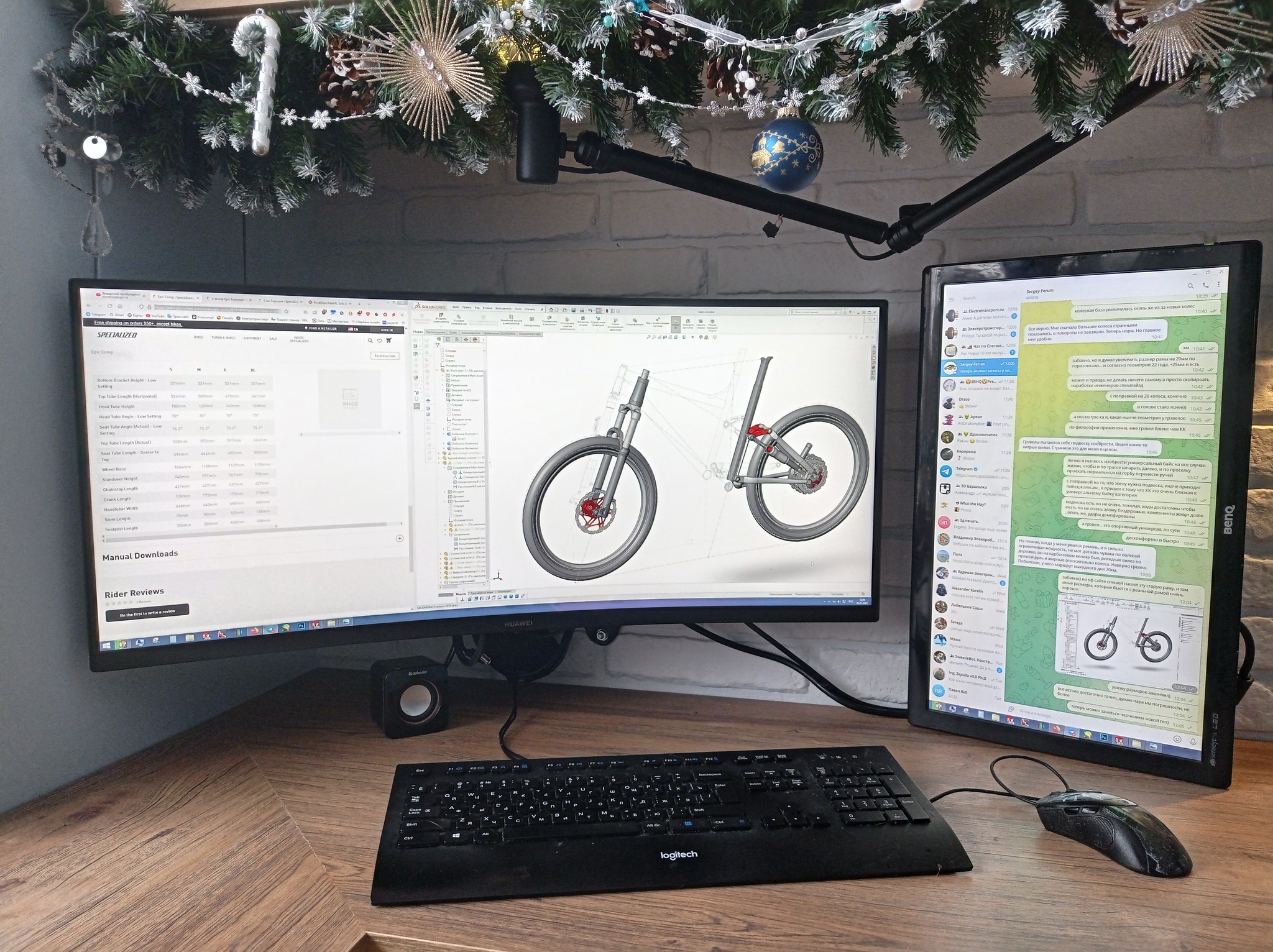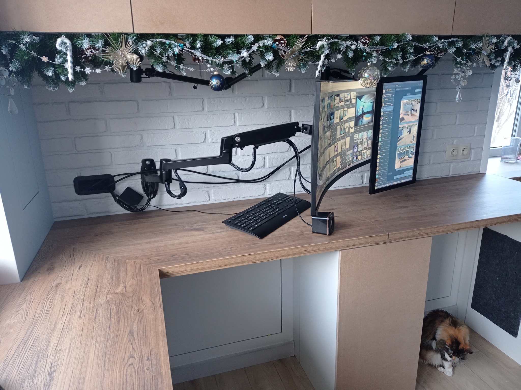 Первое время, я был прям в жутком восторге - новый экран просто поражал воображение своими размерами. Под него был куплен кронштейн, и я решил сохранить и старый монитор - в конце концов, вывести на него референс или рабочий чат - удобно. Вообще, 2 монитора идеально вписались в рабочее место - при работе за вторым рабочим столом, малый монитор можно удобно расположить, выведя на него фоновый фильм, или чертеж, или какой то референс.