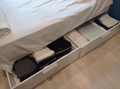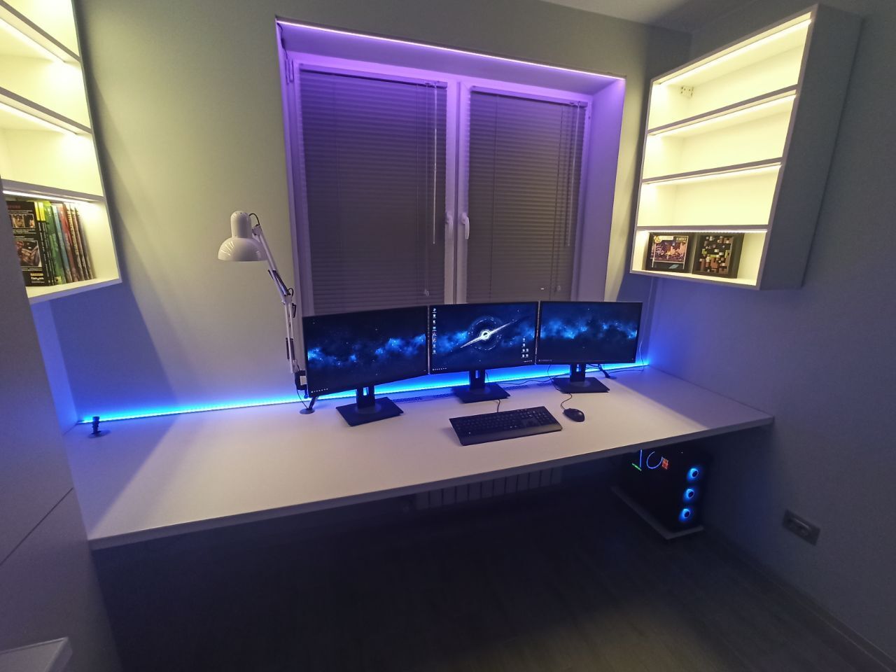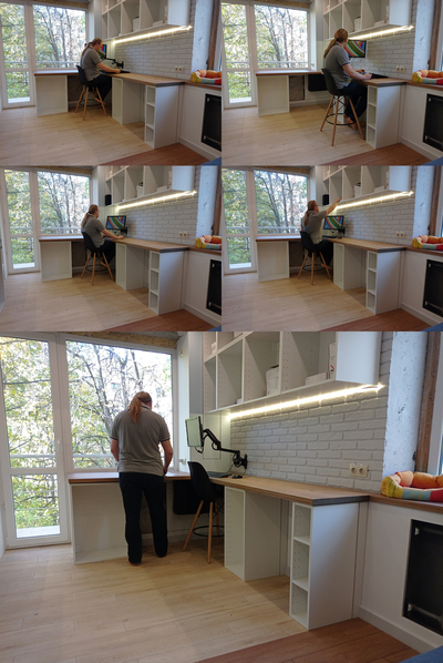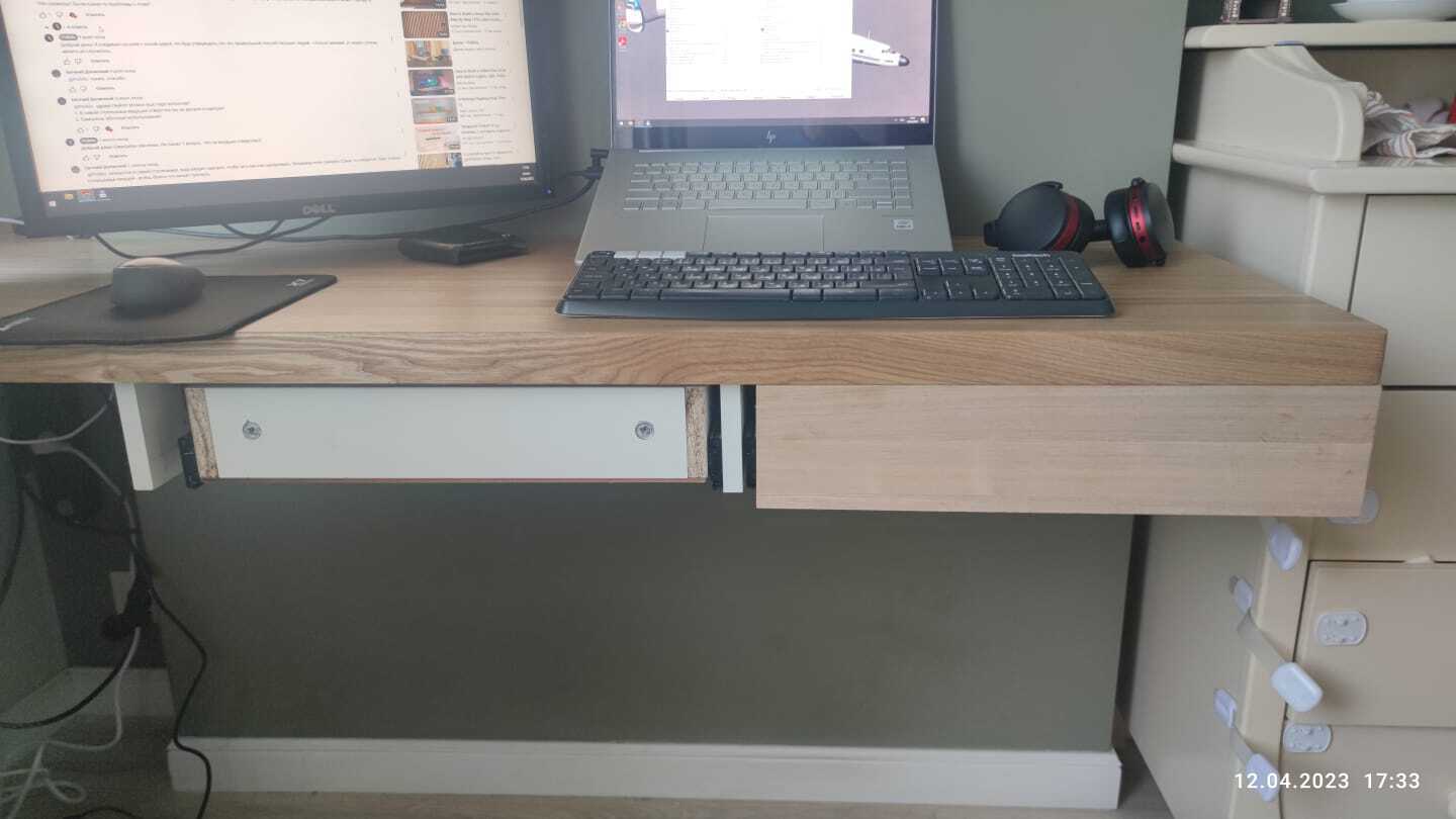 В общем и целом - рабочее место реализовалось примерно на 90% от изначальных идей и задумок. Есть ли что то, что неудобно, или не додумано? Да, отчасти есть - как я сказал, добавление еще одного освещения - это импровизация, а не изначальный проект. Также, я немного промахнулся с размерами столов - расстояние между тумб , хоть и достаточно для стула, маловато - +10, +20см и было бы идеально. Это не критичная недоработка, да и размеры комнаты ограничены - но все же, факт есть факт, этот недостаток проявляется в том, что при выезде из за стола ножки стула периодически стукаются о тумбу.
