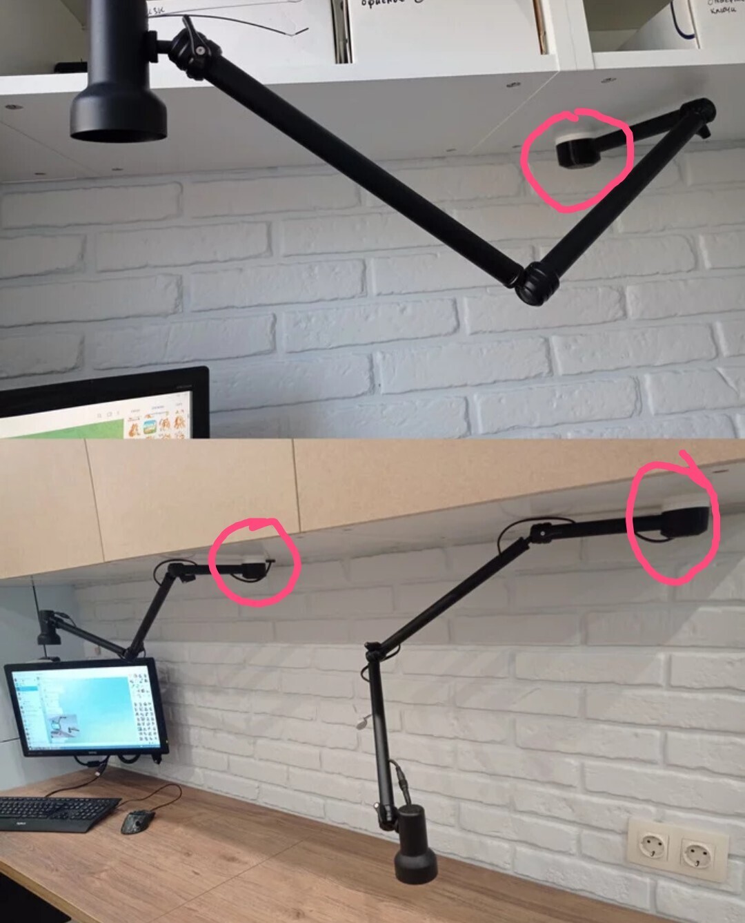У штативов (точнее, штанг) отпилил основания, вместо них отпечатал еще один шарнир, вращающийся на 360 градусов и имеющий крепление к потолку шкафчиков. В трубках просверлил отверстия, и протащил внутри проводку. Вывел проводку за шкафы, где есть трансформаторы 12в, и запитал свои новые лампы.