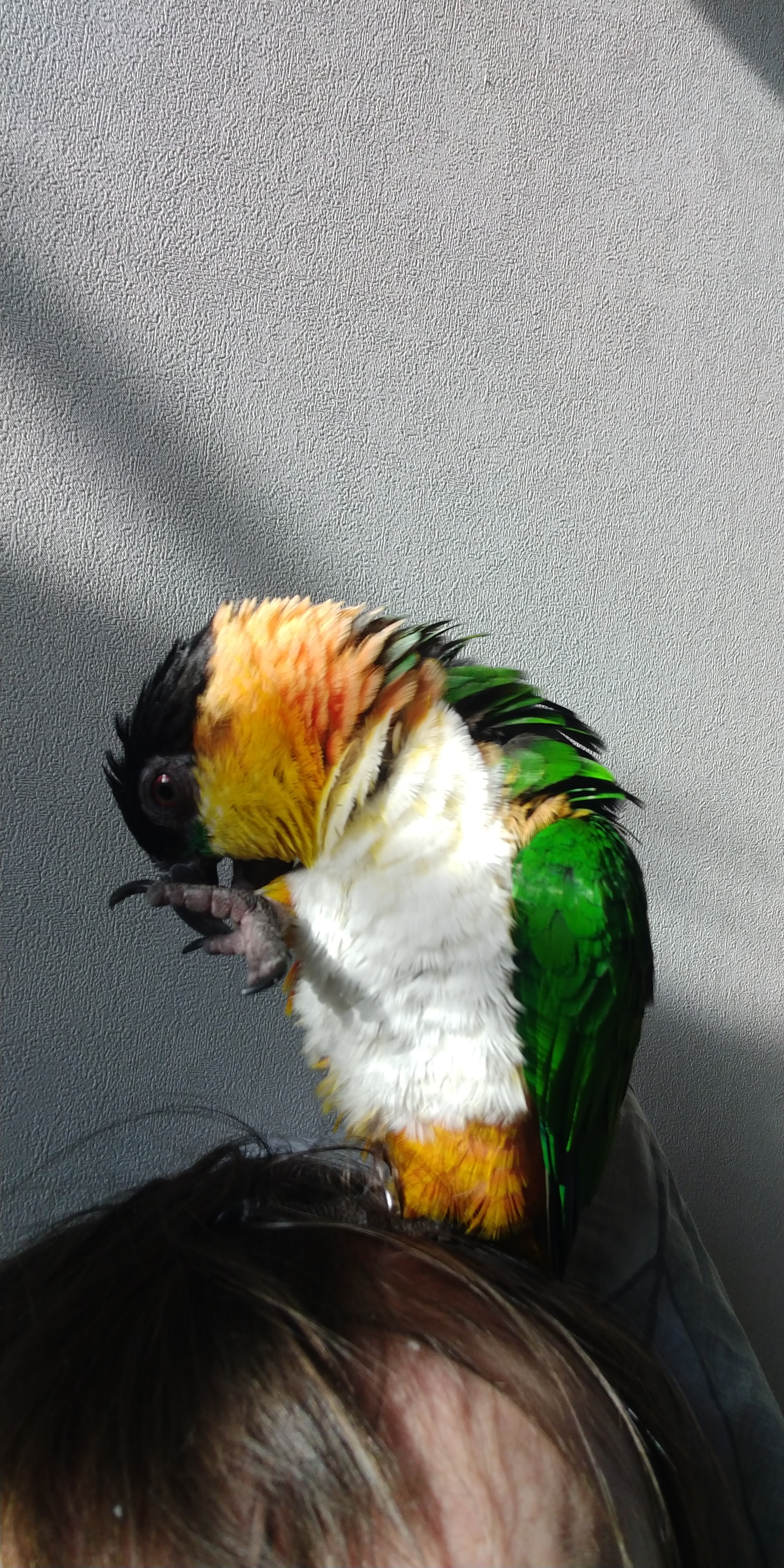 Сейчас сидит у меня на голове и чистит перья, трясет перхотью)))