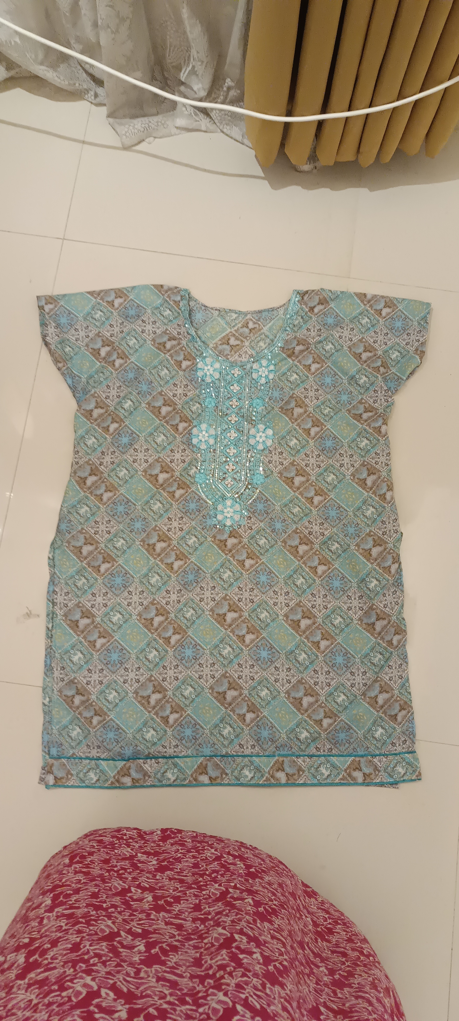 Это Мика, а на ней проект рубашки для детей из трущоб, которые я планирую шить. Я заметила, что дети бегают с голой попой, видимо потому что марают штанишки. Мой дизайн и прикрывает попу и ребёнок сможет сам сходить в туалет.